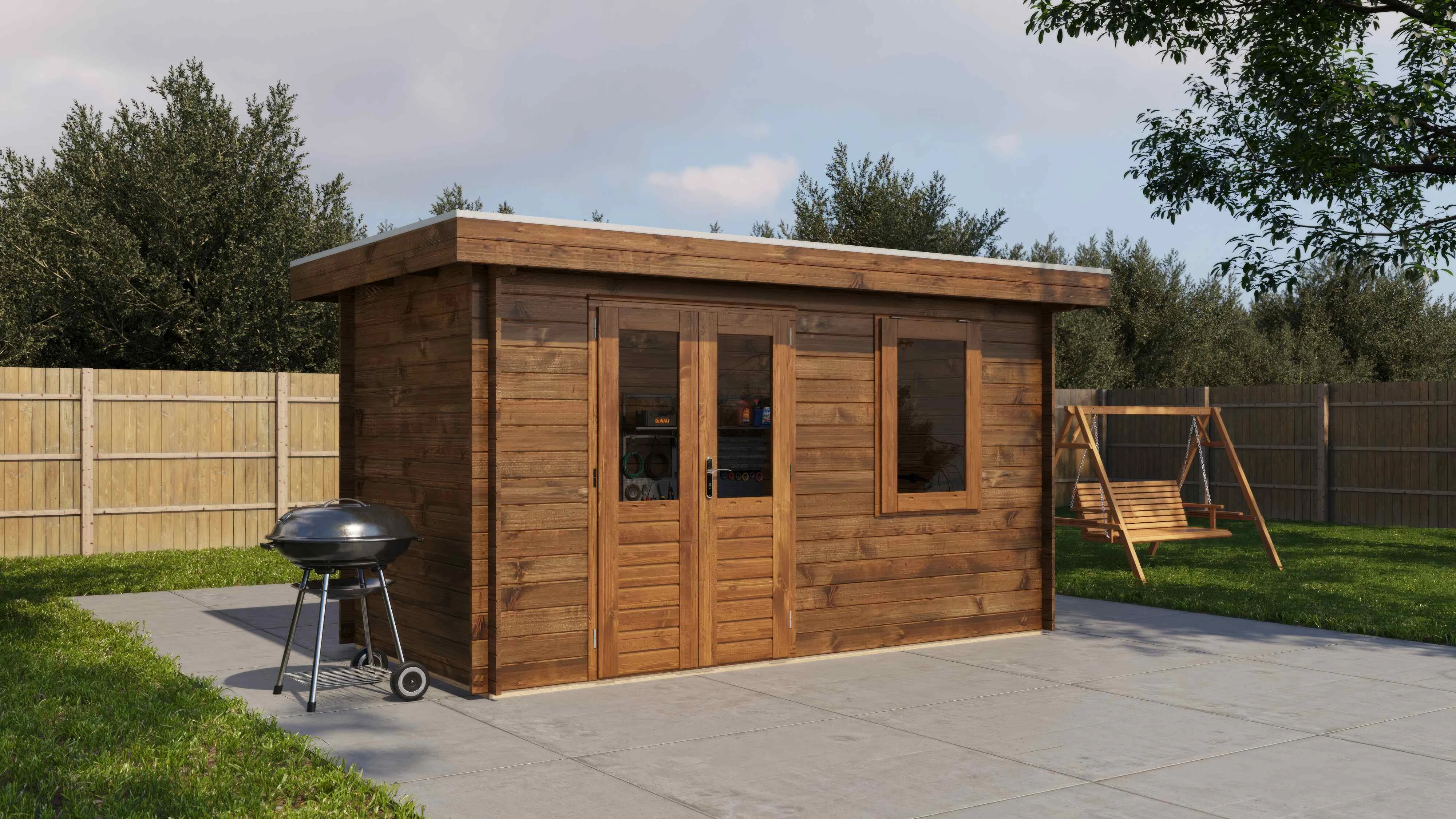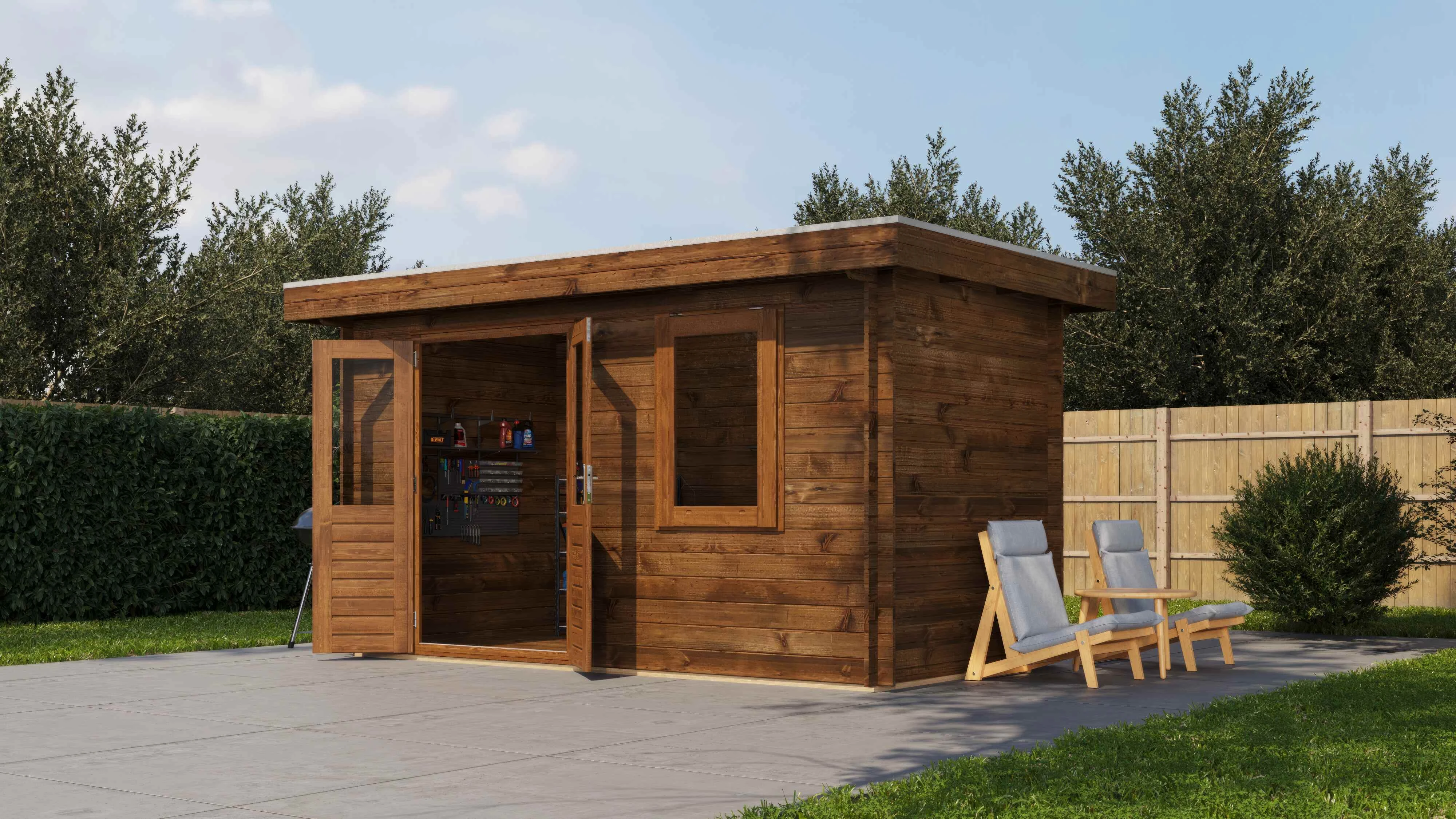 Das Lugarde Select Blockhaus verbindet traditionelle Holzbauweise mit moderner Funktionalität. Mit einer Grundfläche von 400 × 200 cm bietet es vielseitige Nutzungsmöglichkeiten für Ihren Garten.