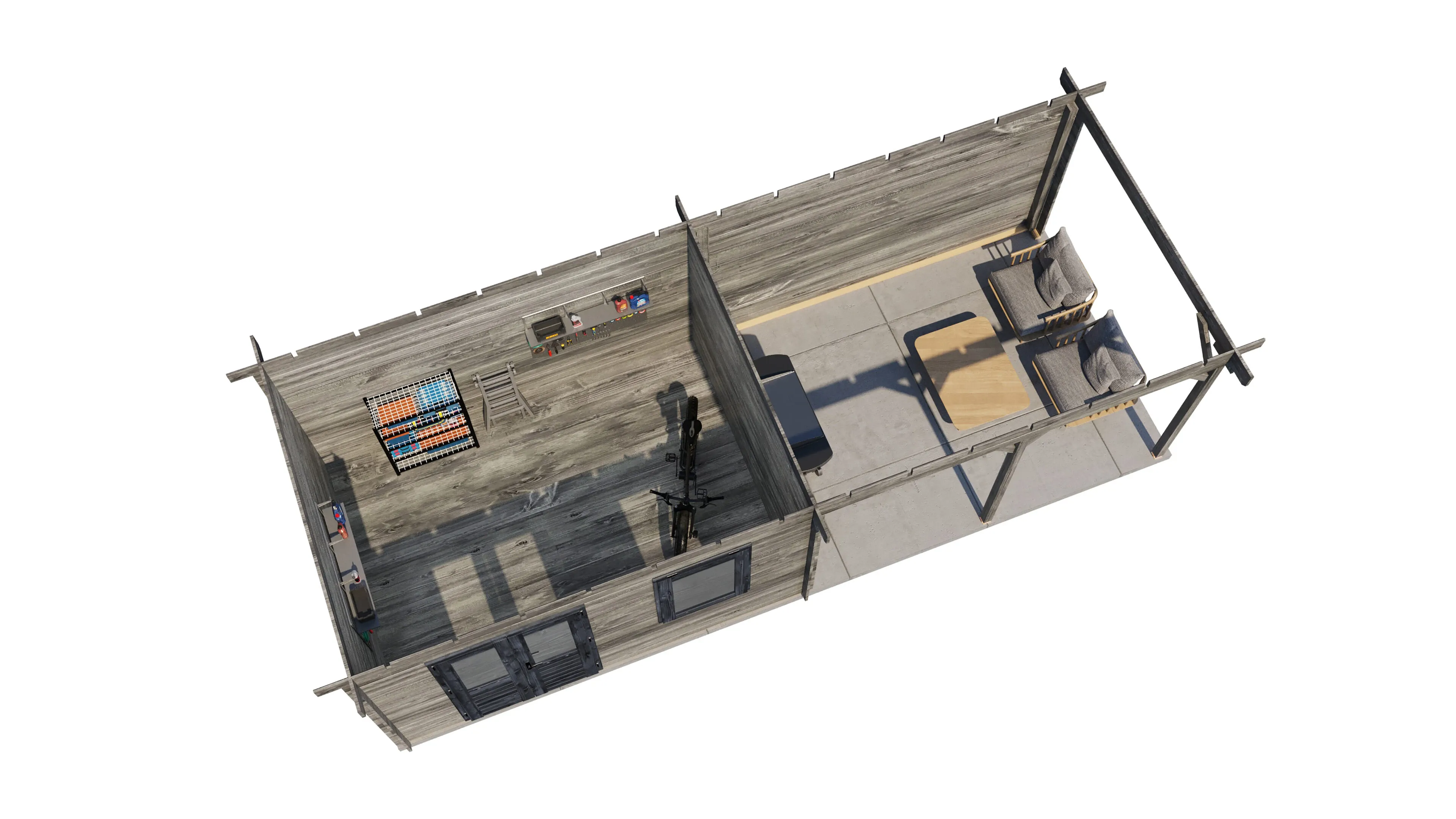 Die Konstruktion basiert auf bewährter Blockbauweise mit präzise gearbeiteten Elementen aus getrocknetem Fichtenholz. Die 28 mm starken Blockbohlen gewährleisten eine robuste und langlebige Konstruktion. Die 18 mm Dachschalung mit Nut-Feder-System sorgt für eine stabile und dichte Dachkonstruktion.