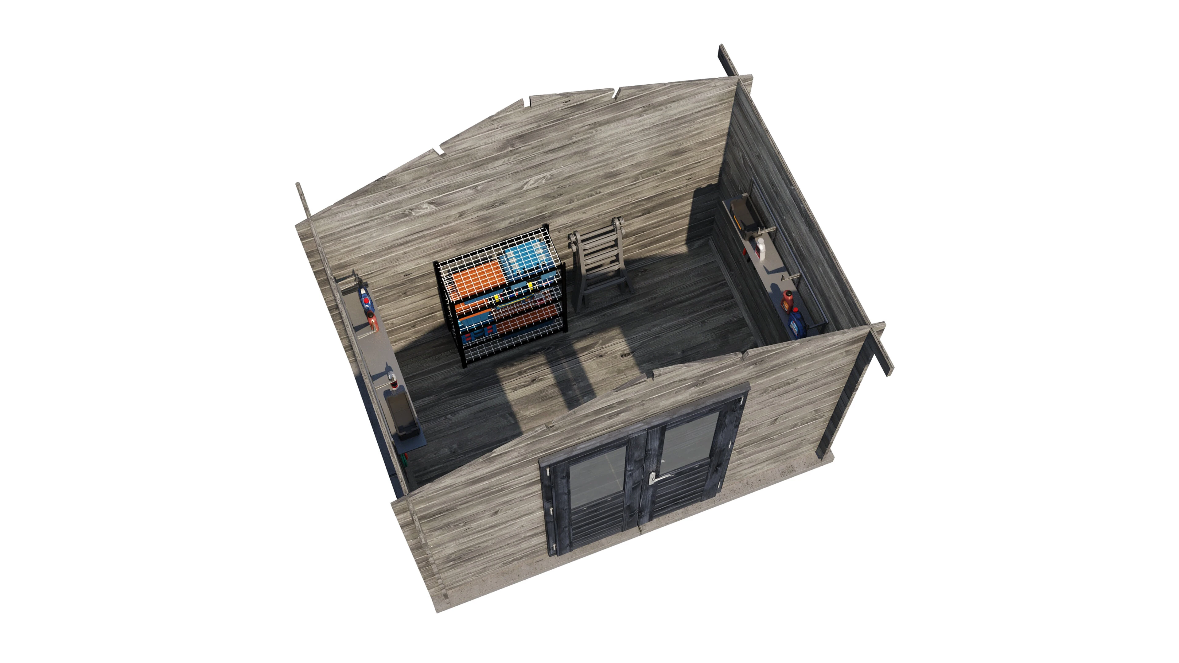 Die Konstruktion basiert auf bewährter Blockbauweise mit präzise gearbeiteten Elementen aus getrocknetem Fichtenholz. Die 28 mm starken Blockbohlen gewährleisten eine robuste und langlebige Konstruktion. Die 18 mm Dachschalung mit Nut-Feder-System sorgt für eine stabile und dichte Dachkonstruktion.