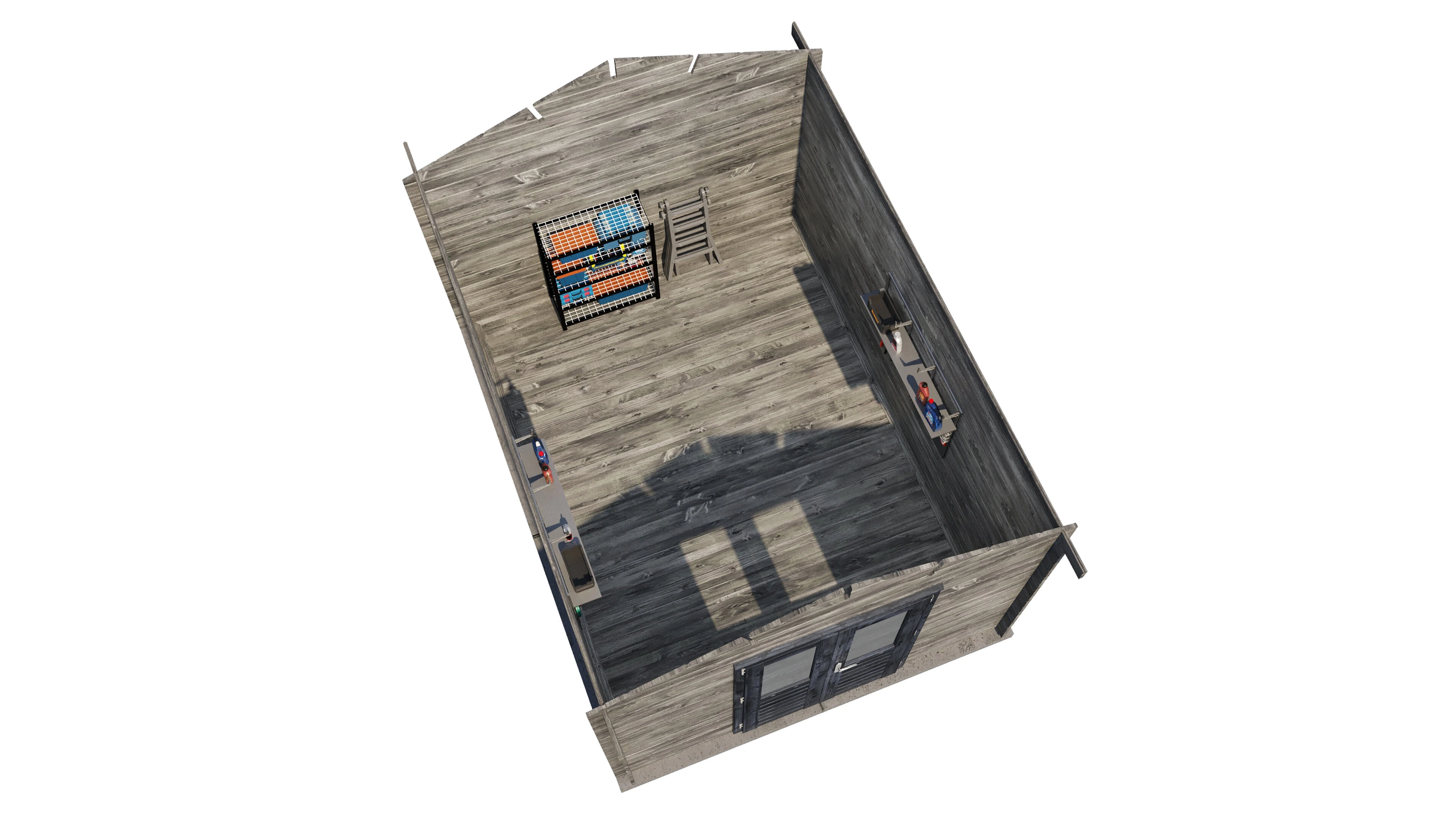 Die Konstruktion basiert auf bewährter Blockbauweise mit präzise gearbeiteten Elementen aus getrocknetem Fichtenholz. Die 28 mm starken Blockbohlen gewährleisten eine robuste und langlebige Konstruktion. Die 18 mm Dachschalung mit Nut-Feder-System sorgt für eine stabile und dichte Dachkonstruktion.