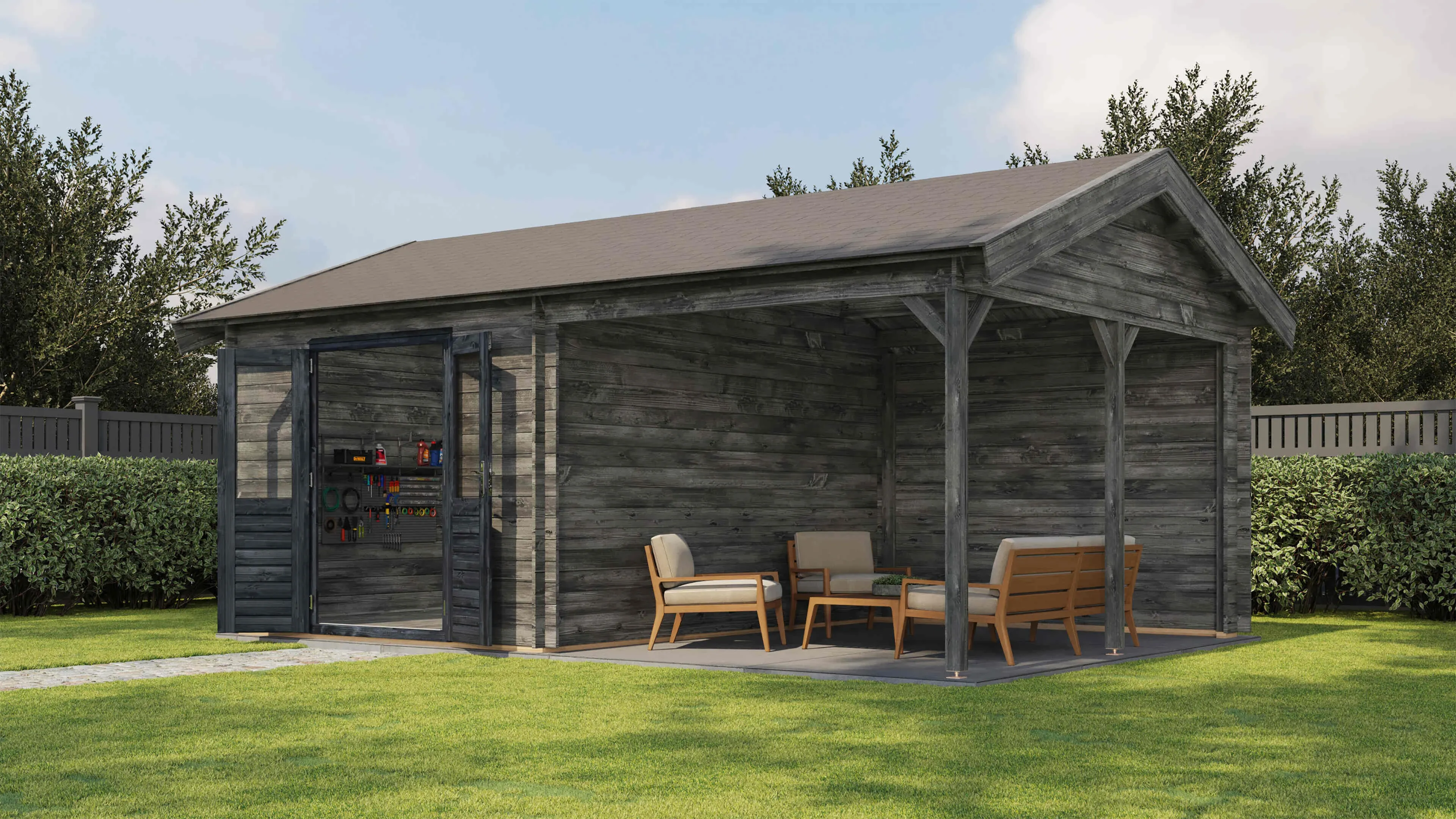 Das Lugarde Select Blockhaus verbindet traditionelle Holzbauweise mit moderner Funktionalität. Mit einer Grundfläche von 300 × 400 cm bietet es vielseitige Nutzungsmöglichkeiten für Ihren Garten.