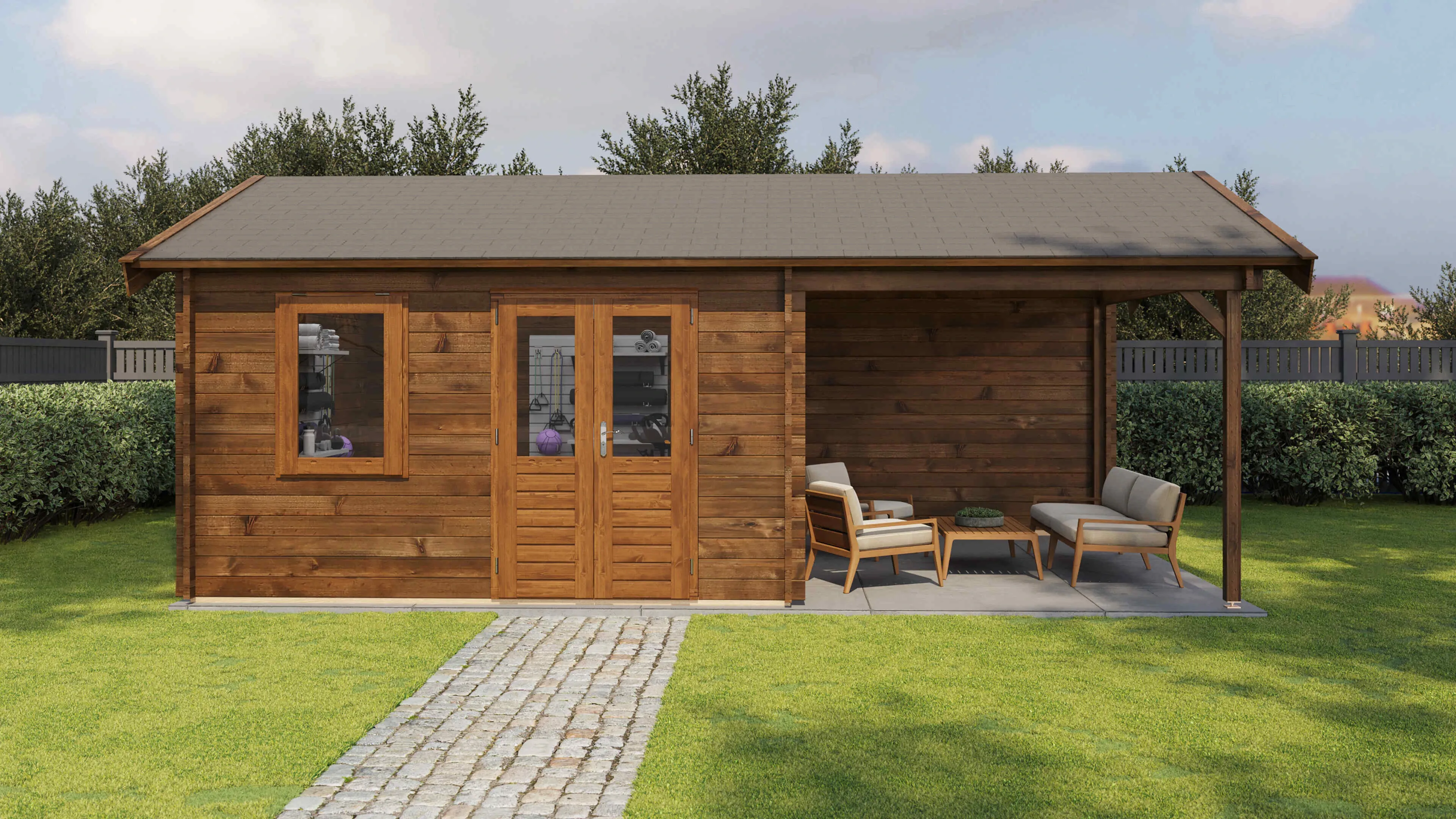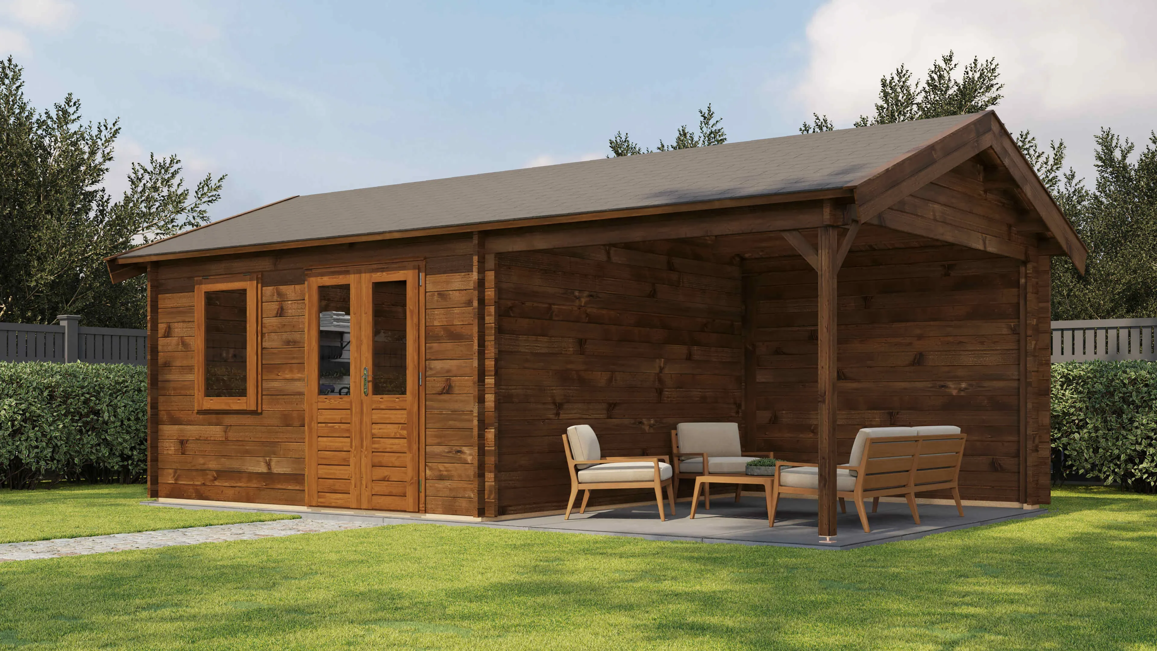 Das Lugarde Select Blockhaus verbindet traditionelle Holzbauweise mit moderner Funktionalität. Mit einer Grundfläche von 400 × 400 cm bietet es vielseitige Nutzungsmöglichkeiten für Ihren Garten.