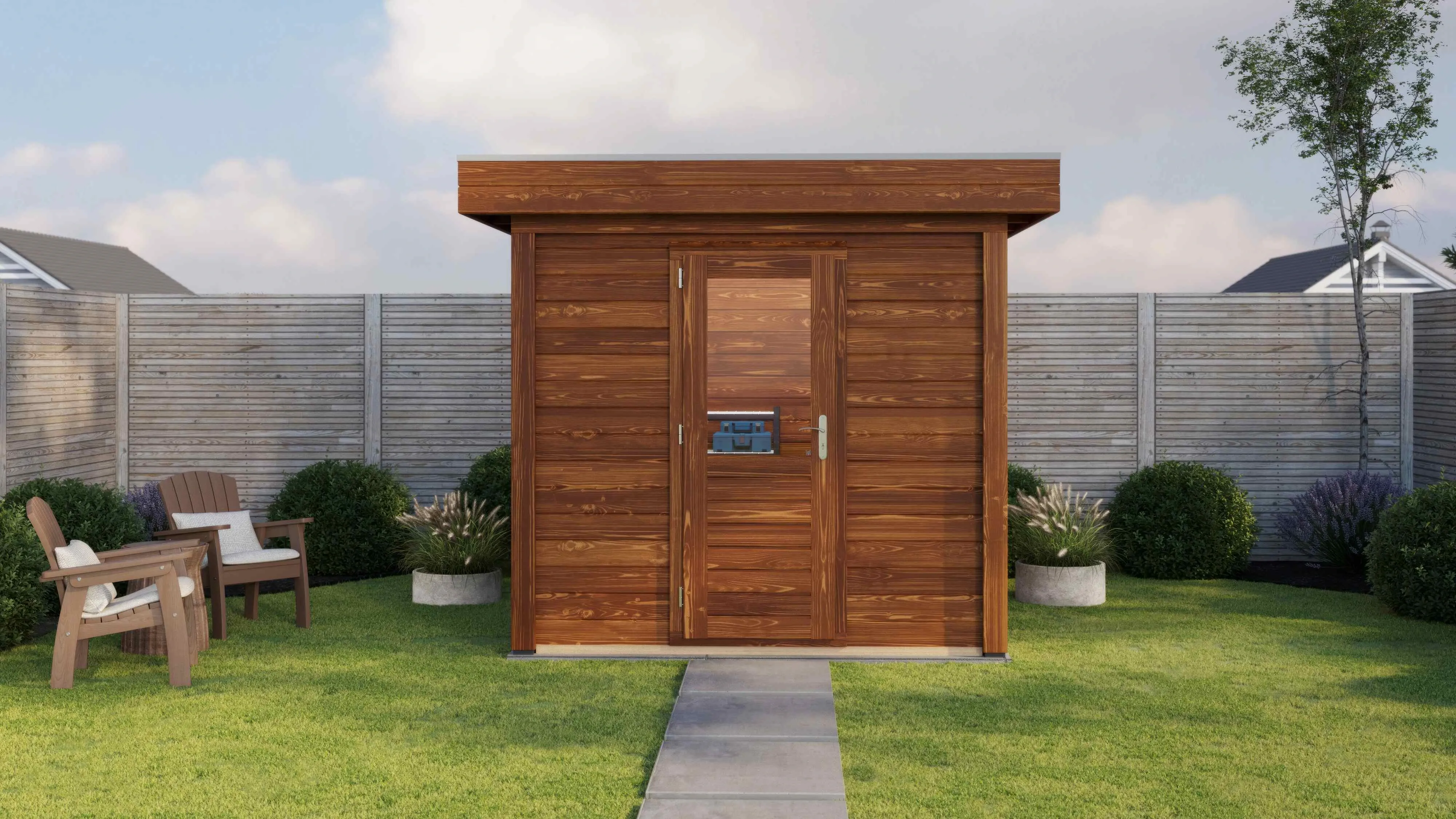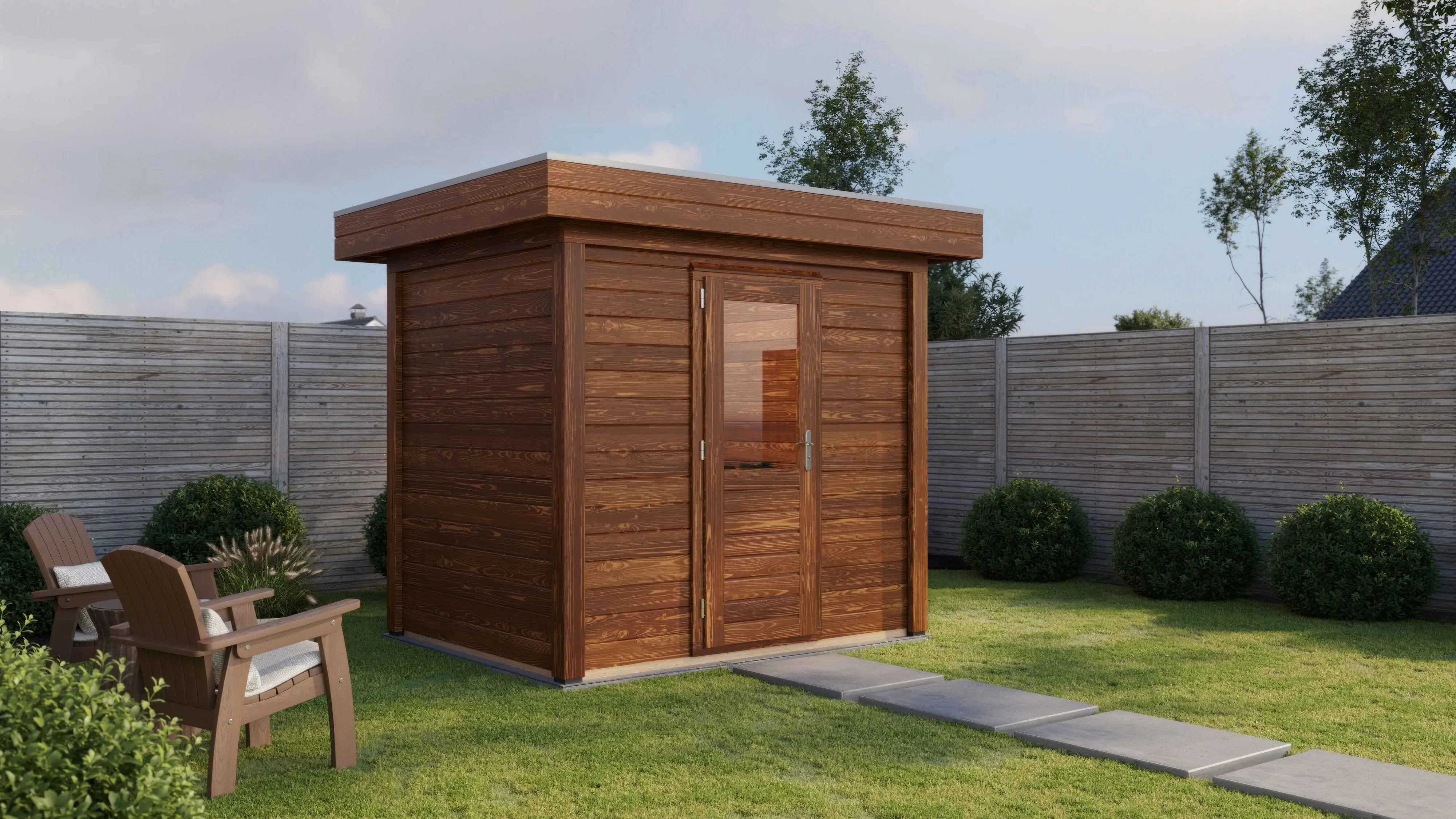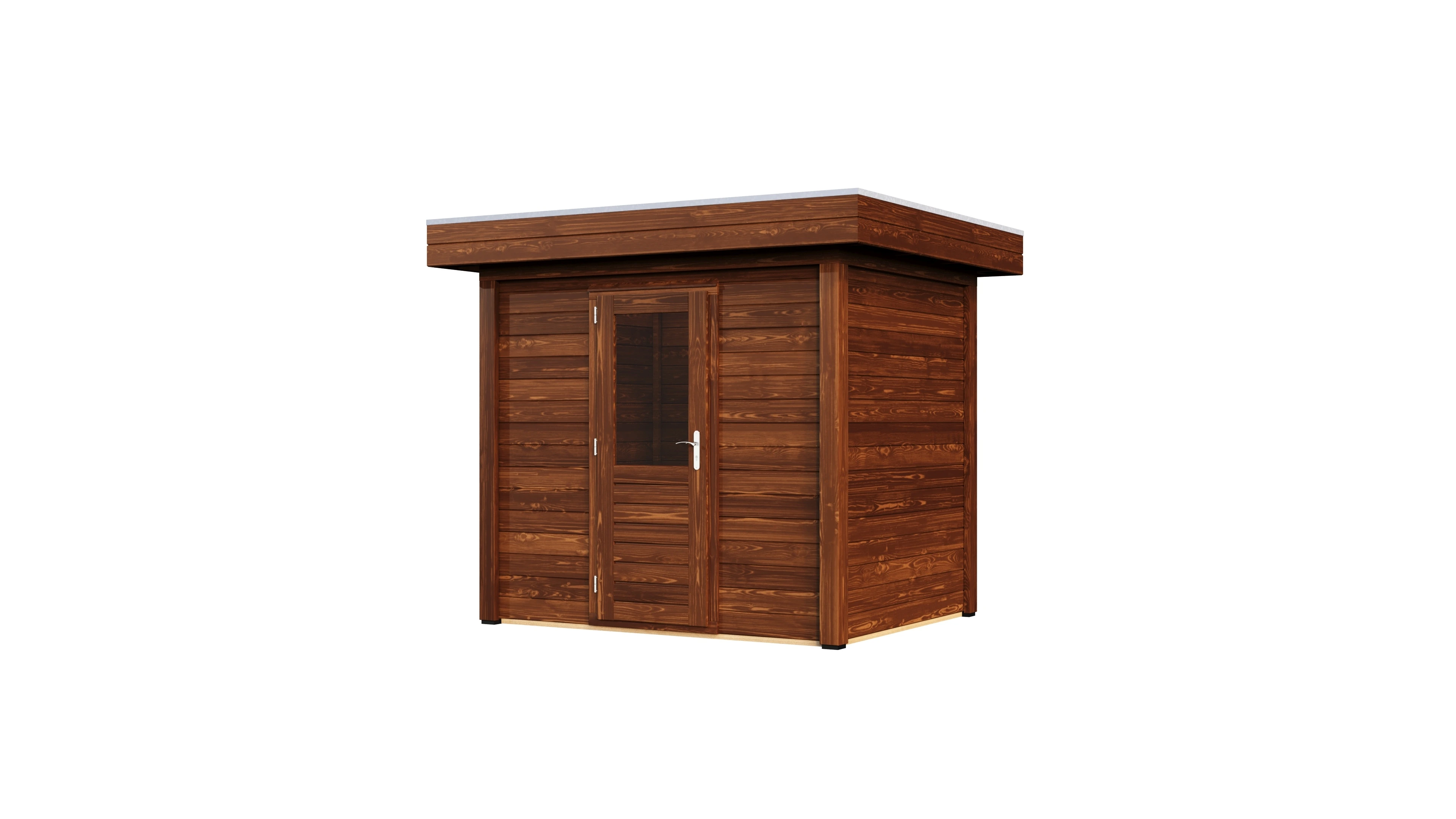 Das charakteristische Flachdach unterstreicht die moderne Formensprache. Die 28 mm starken Wände aus getrocknetem Fichtenholz bieten gute Wärmedämmung und Stabilität. Die Dachkonstruktion mit 18 mm Schalung und Nut-Feder-Verbindung gewährleistet eine dauerhafte Dichtigkeit.