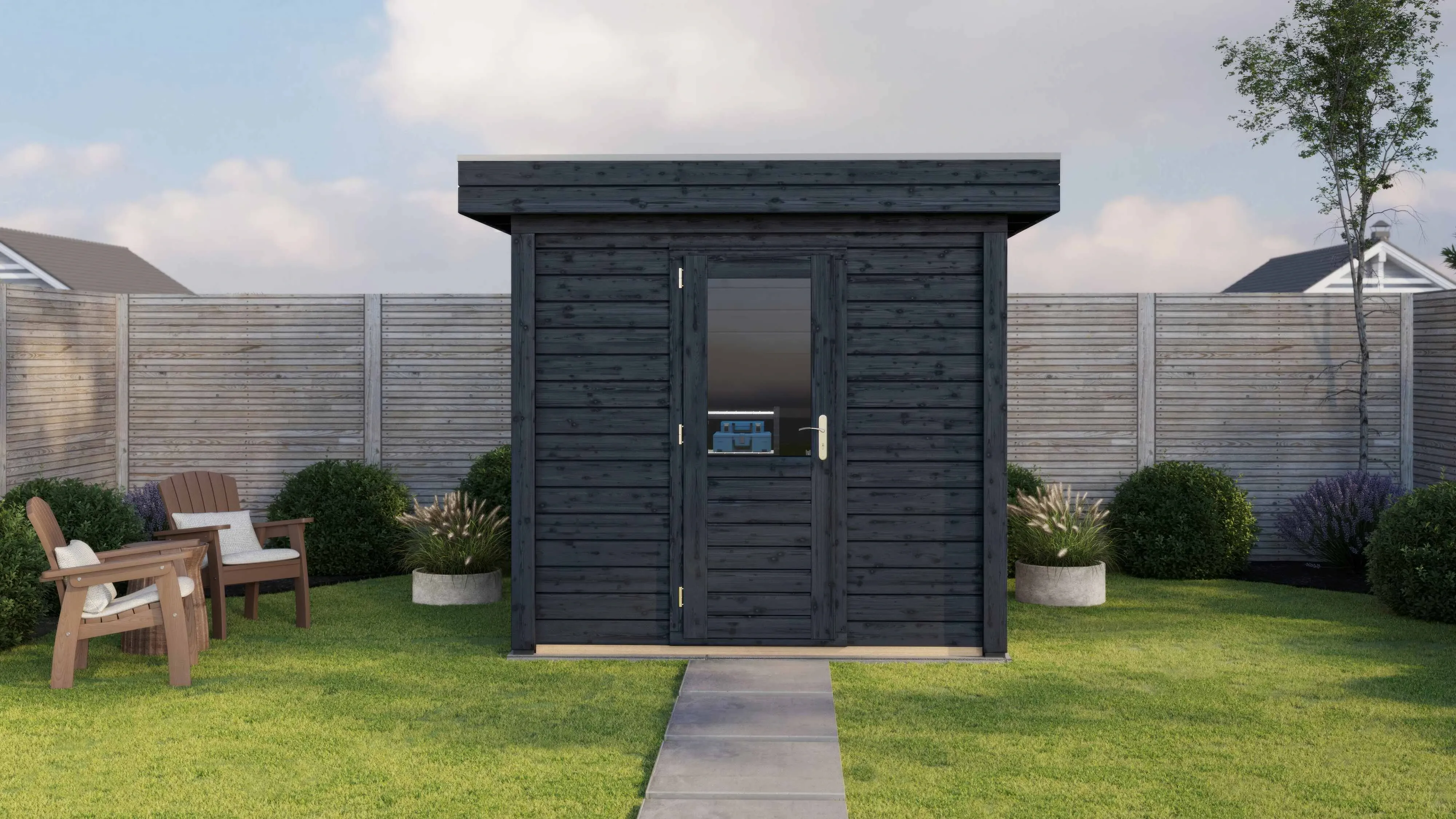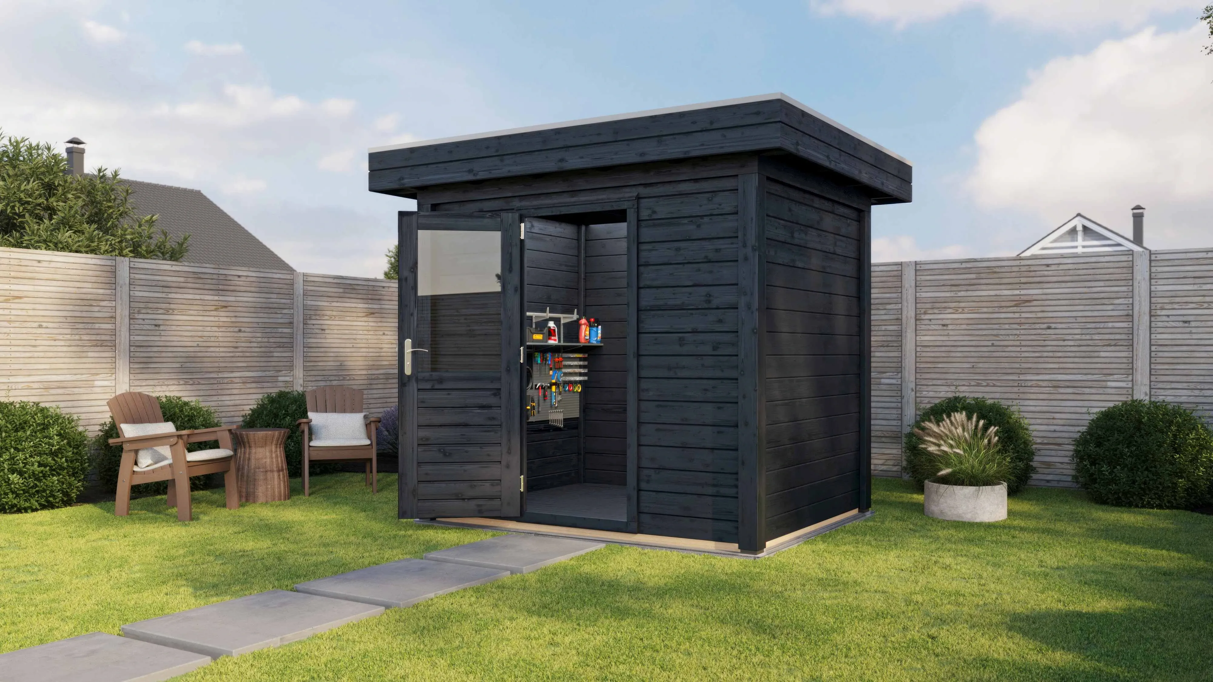 Das Lugarde Select Modern Gartenhaus zeichnet sich durch seine klare, zeitgemäße Architektur aus. Die Grundfläche von 250 × 200 cm ermöglicht eine flexible Nutzung als Arbeitsraum, Hobbyraum oder Rückzugsort.