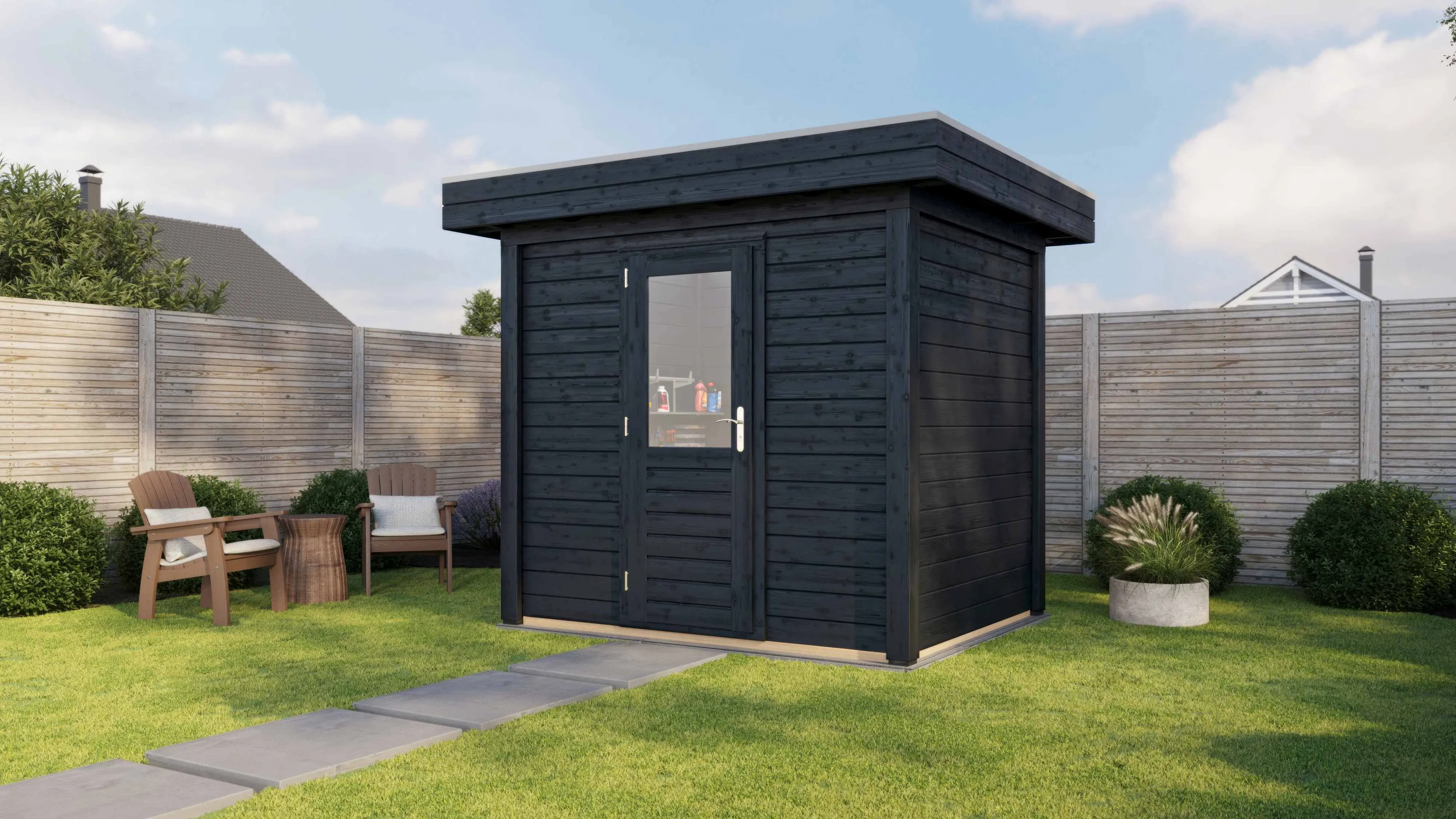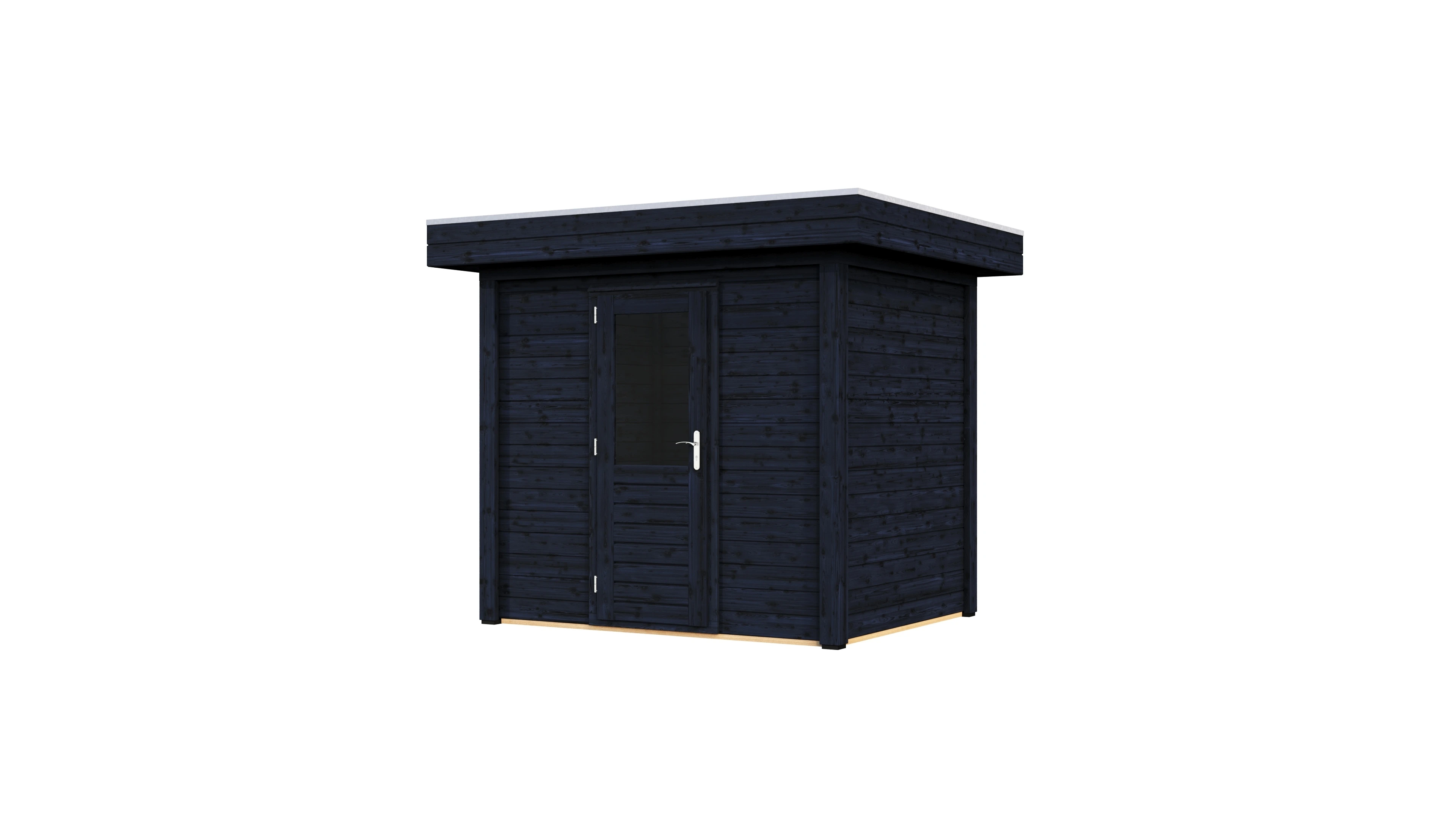 Das charakteristische Flachdach unterstreicht die moderne Formensprache. Die 28 mm starken Wände aus getrocknetem Fichtenholz bieten gute Wärmedämmung und Stabilität. Die Dachkonstruktion mit 18 mm Schalung und Nut-Feder-Verbindung gewährleistet eine dauerhafte Dichtigkeit.