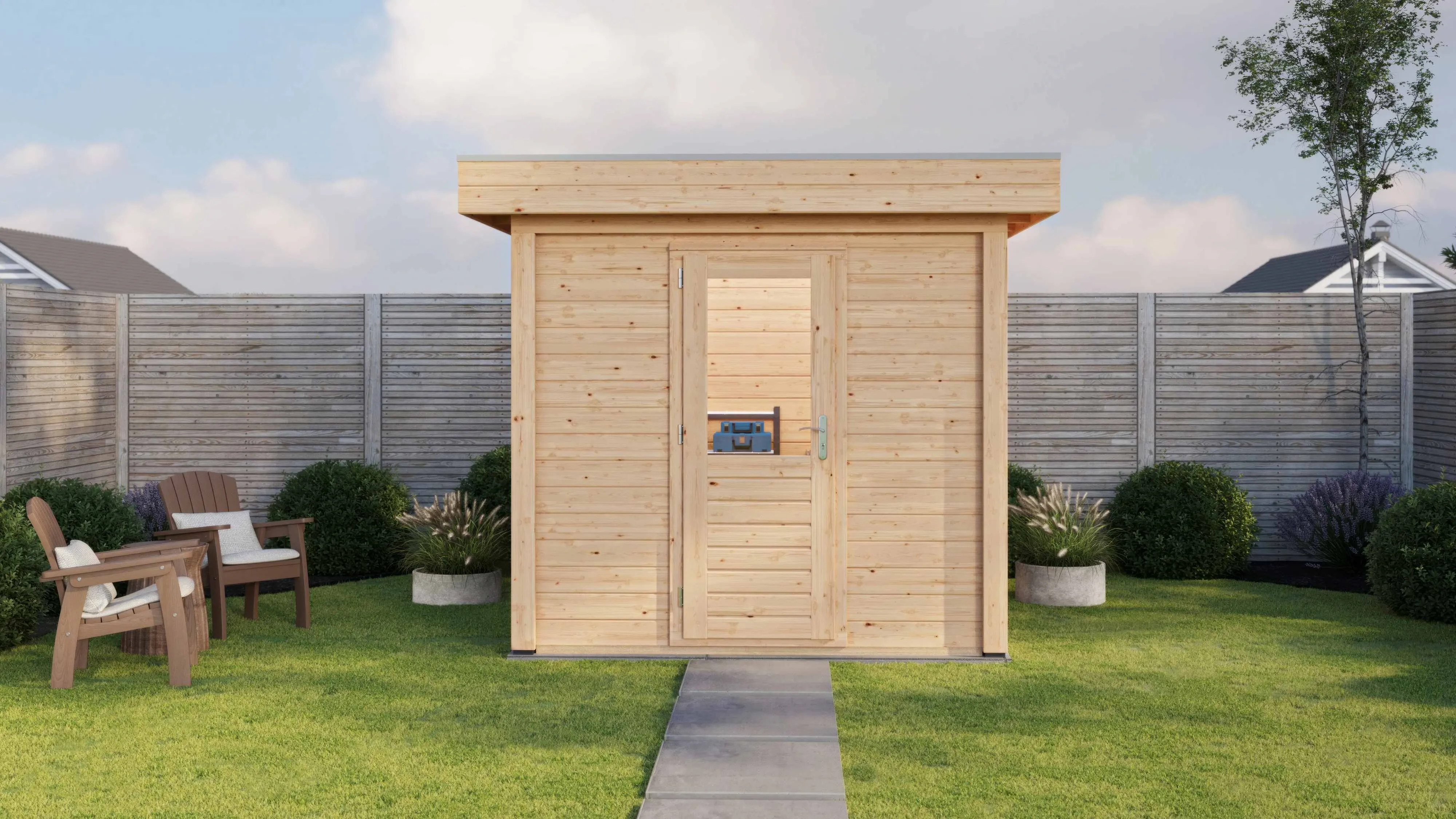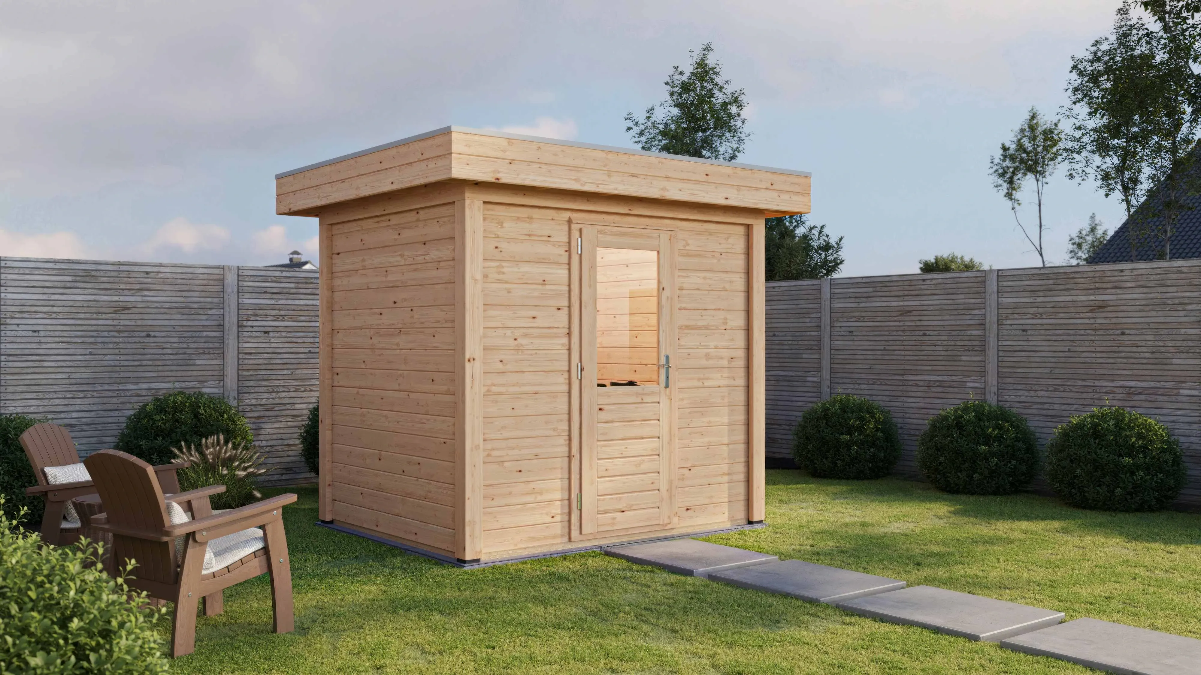 Das charakteristische Flachdach unterstreicht die moderne Formensprache. Die 28 mm starken Wände aus getrocknetem Fichtenholz bieten gute Wärmedämmung und Stabilität. Die Dachkonstruktion mit 18 mm Schalung und Nut-Feder-Verbindung gewährleistet eine dauerhafte Dichtigkeit.