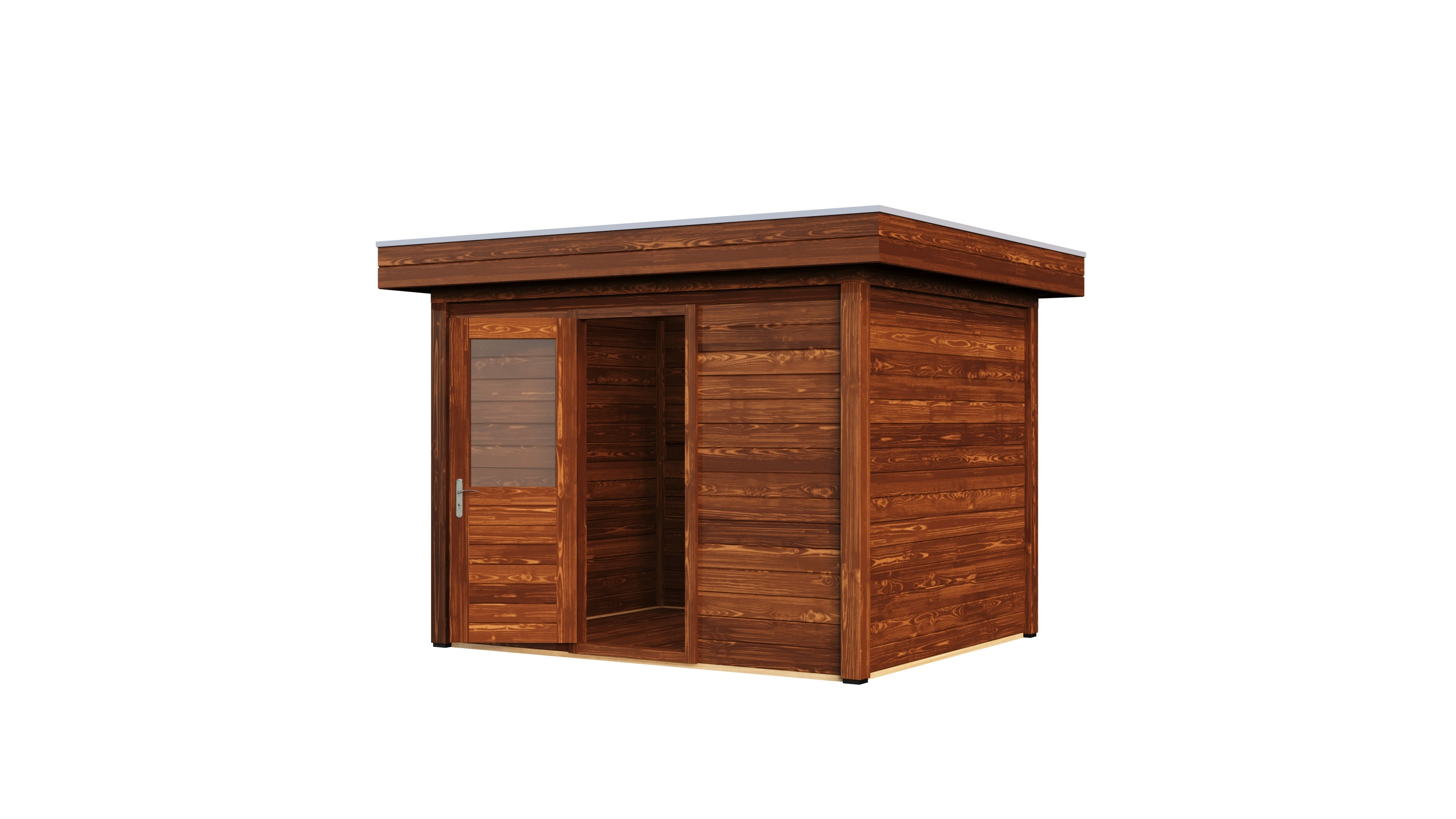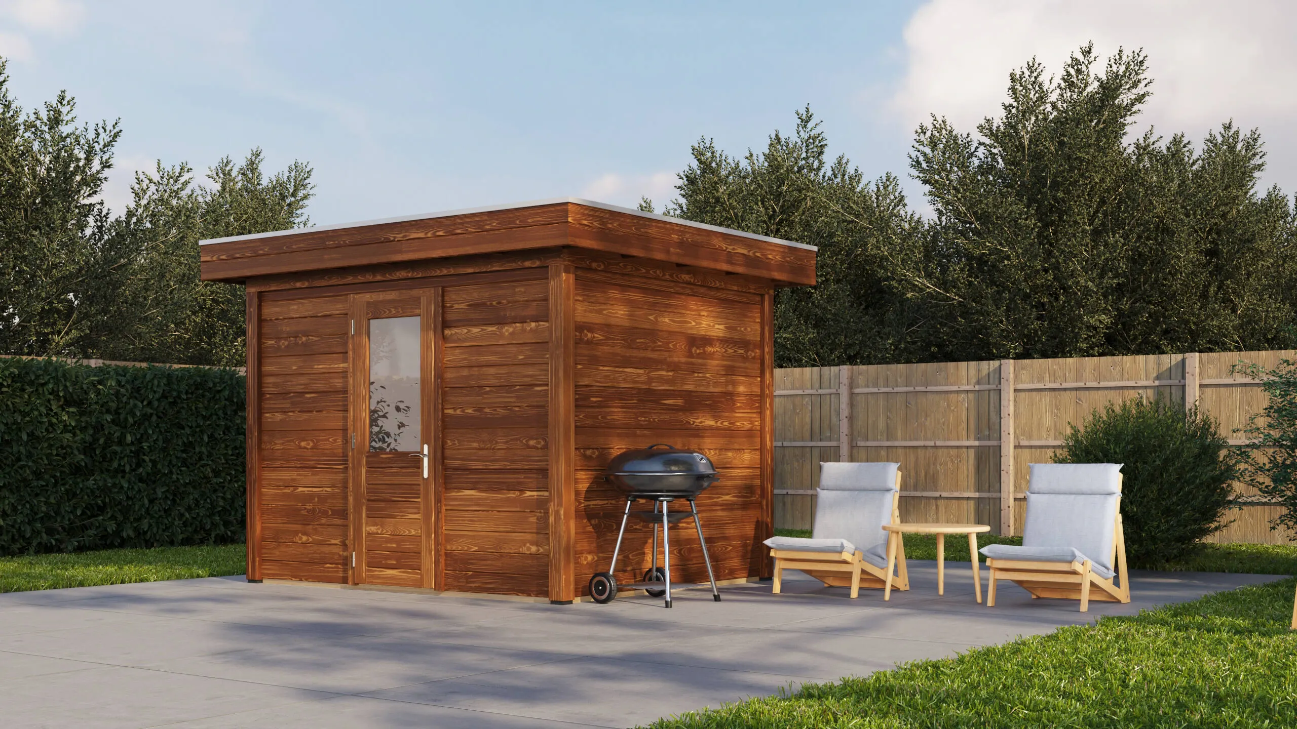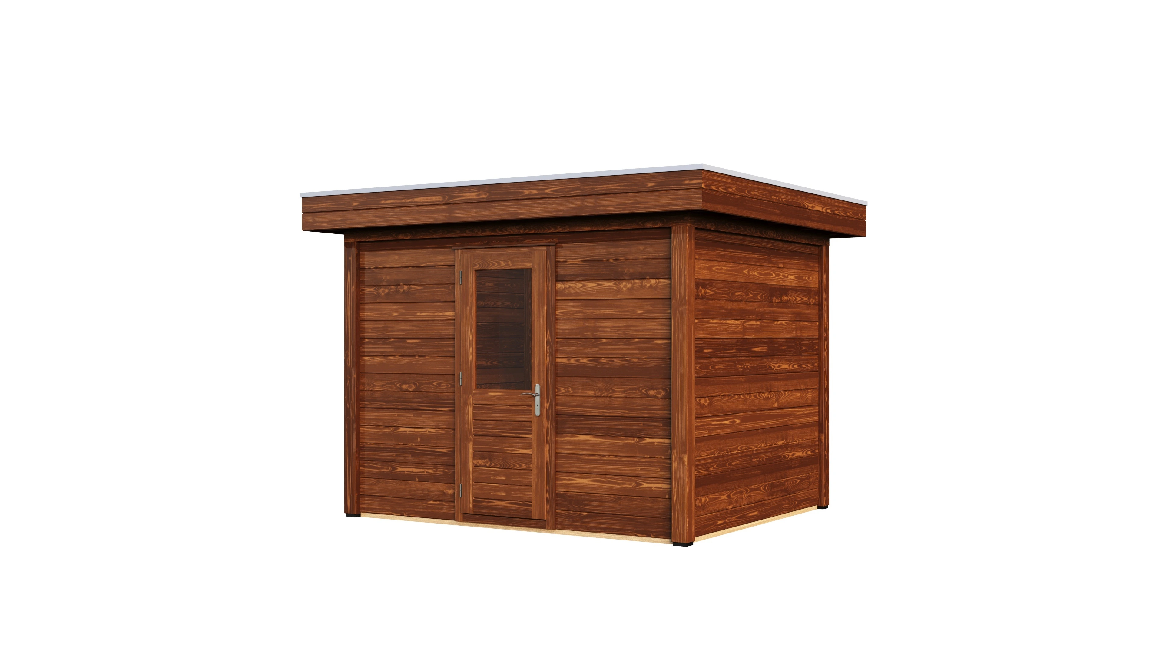 Das charakteristische Flachdach unterstreicht die moderne Formensprache. Die 28 mm starken Wände aus getrocknetem Fichtenholz bieten gute Wärmedämmung und Stabilität. Die Dachkonstruktion mit 18 mm Schalung und Nut-Feder-Verbindung gewährleistet eine dauerhafte Dichtigkeit.