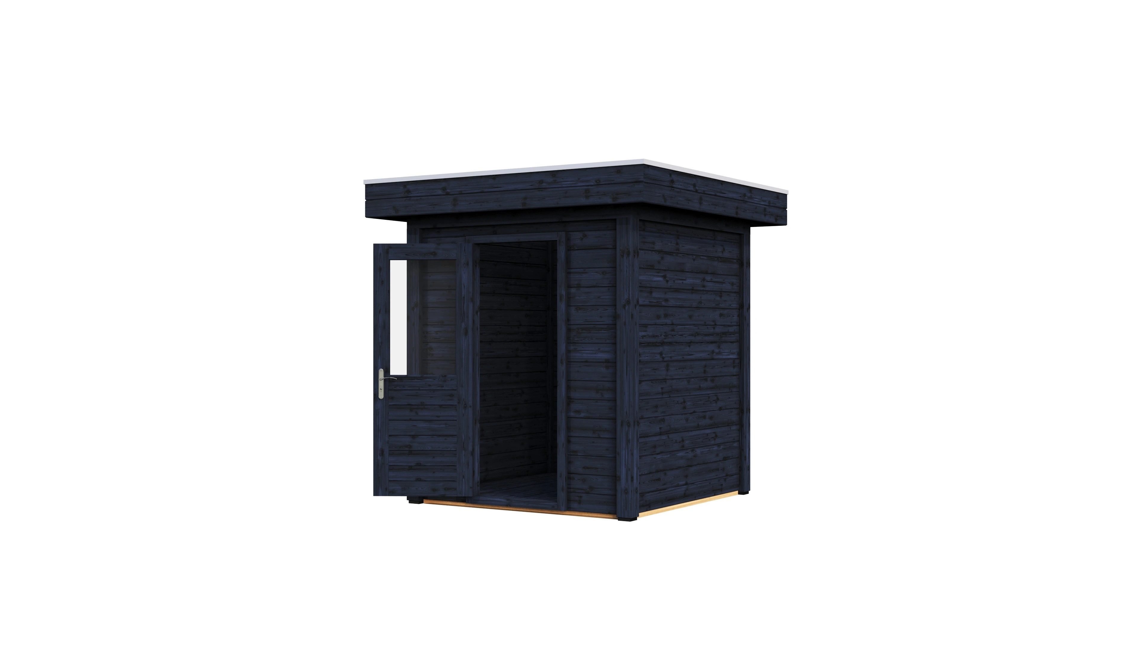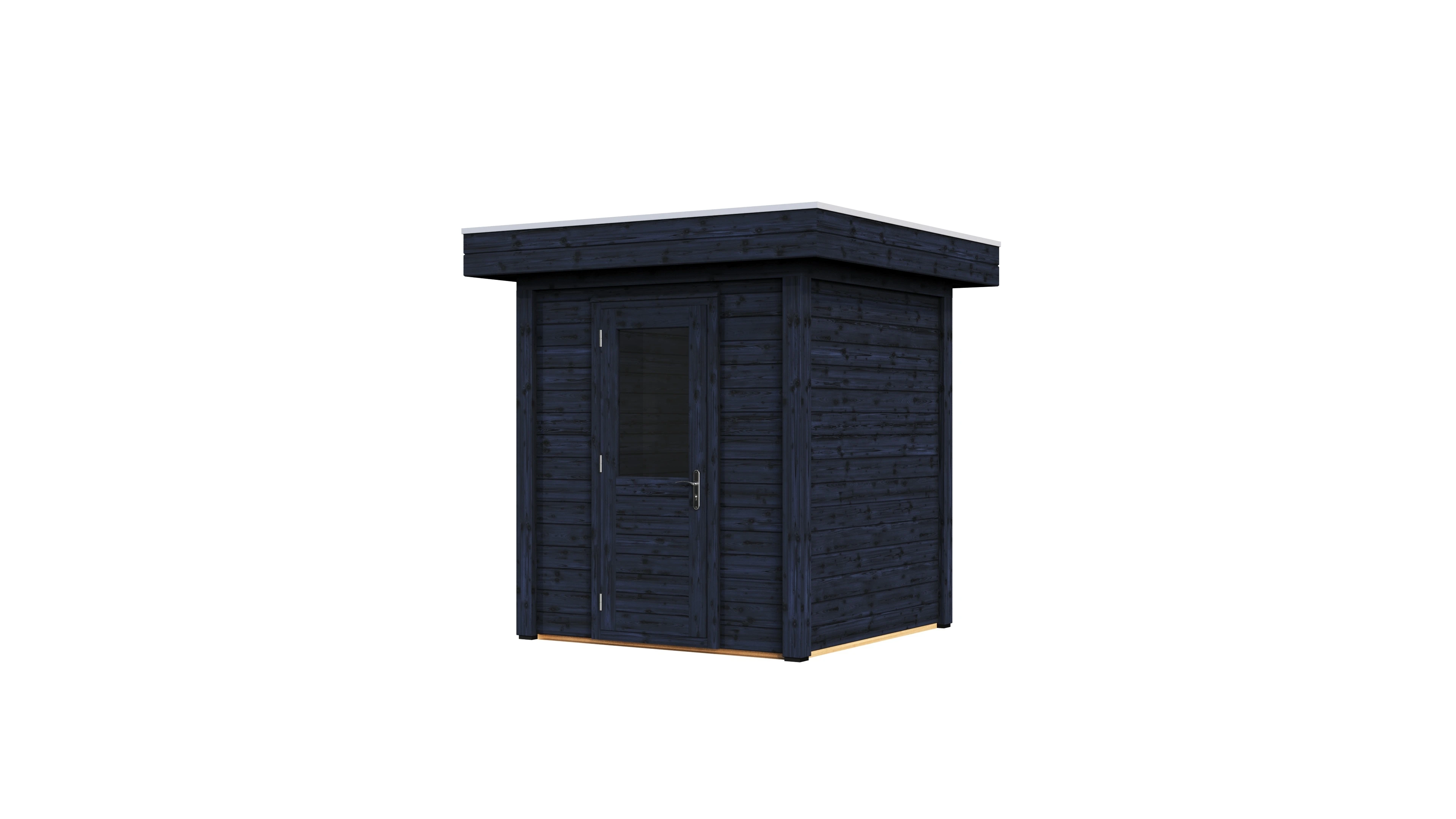Das charakteristische Flachdach unterstreicht die moderne Formensprache. Die 28 mm starken Wände aus getrocknetem Fichtenholz bieten gute Wärmedämmung und Stabilität. Die Dachkonstruktion mit 18 mm Schalung und Nut-Feder-Verbindung gewährleistet eine dauerhafte Dichtigkeit.