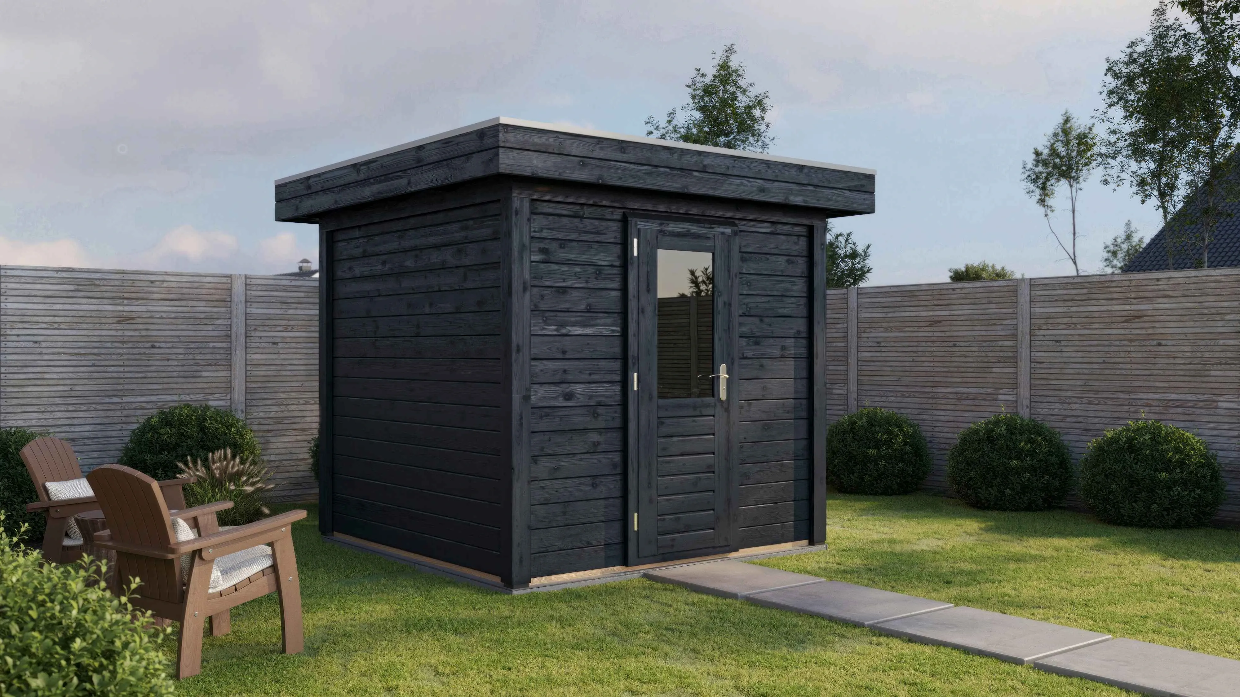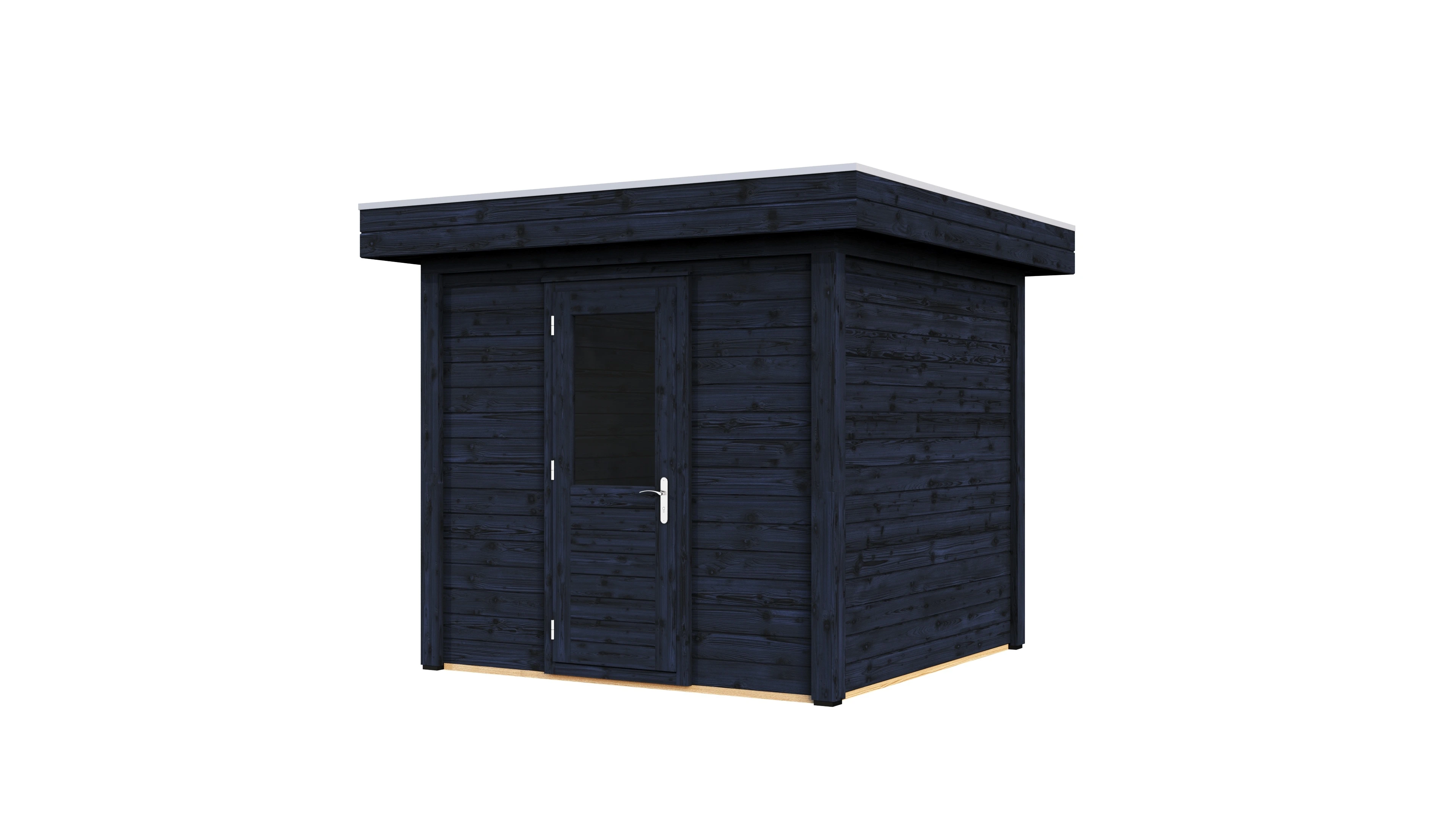 Das charakteristische Flachdach unterstreicht die moderne Formensprache. Die 28 mm starken Wände aus getrocknetem Fichtenholz bieten gute Wärmedämmung und Stabilität. Die Dachkonstruktion mit 18 mm Schalung und Nut-Feder-Verbindung gewährleistet eine dauerhafte Dichtigkeit.