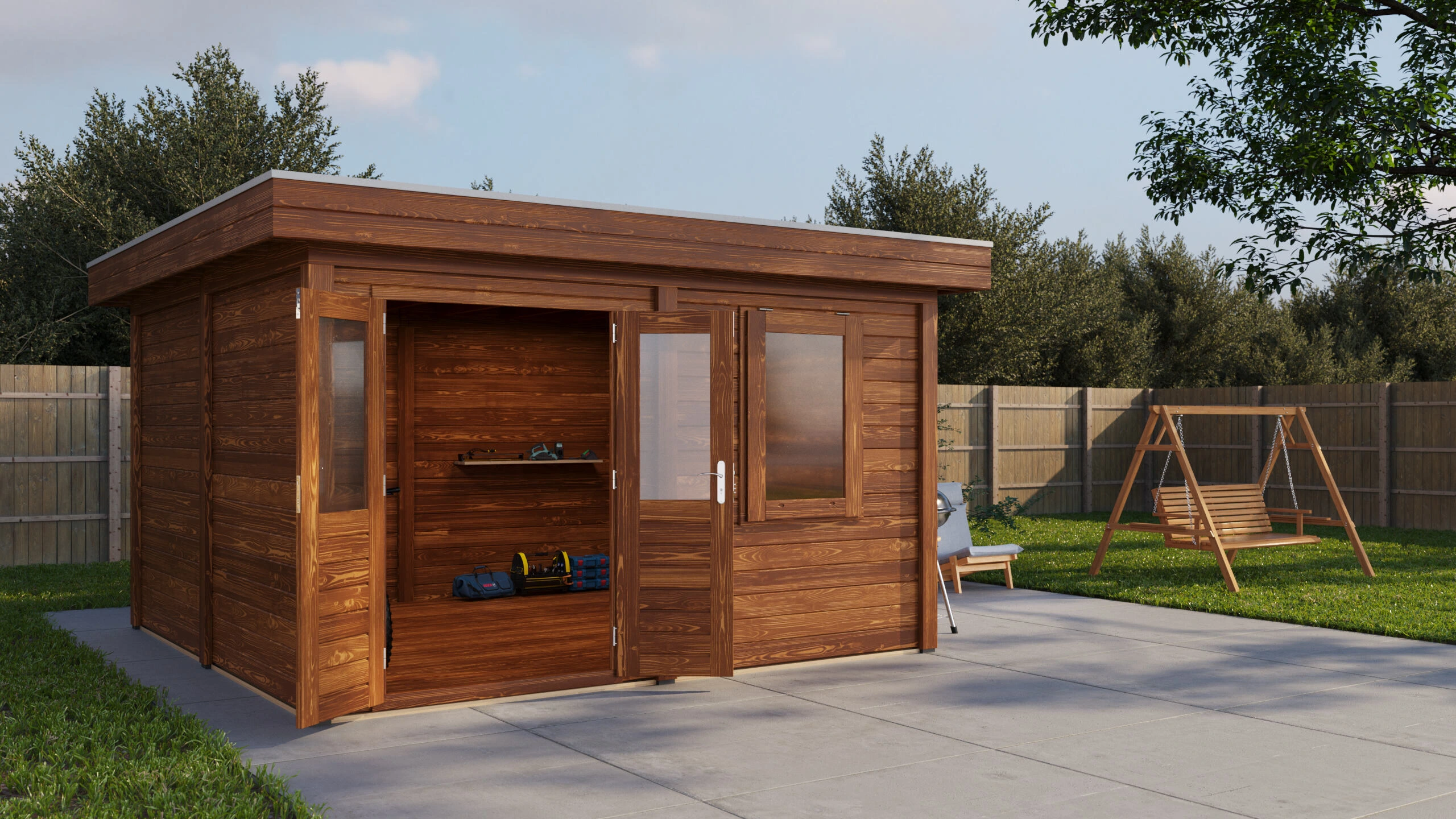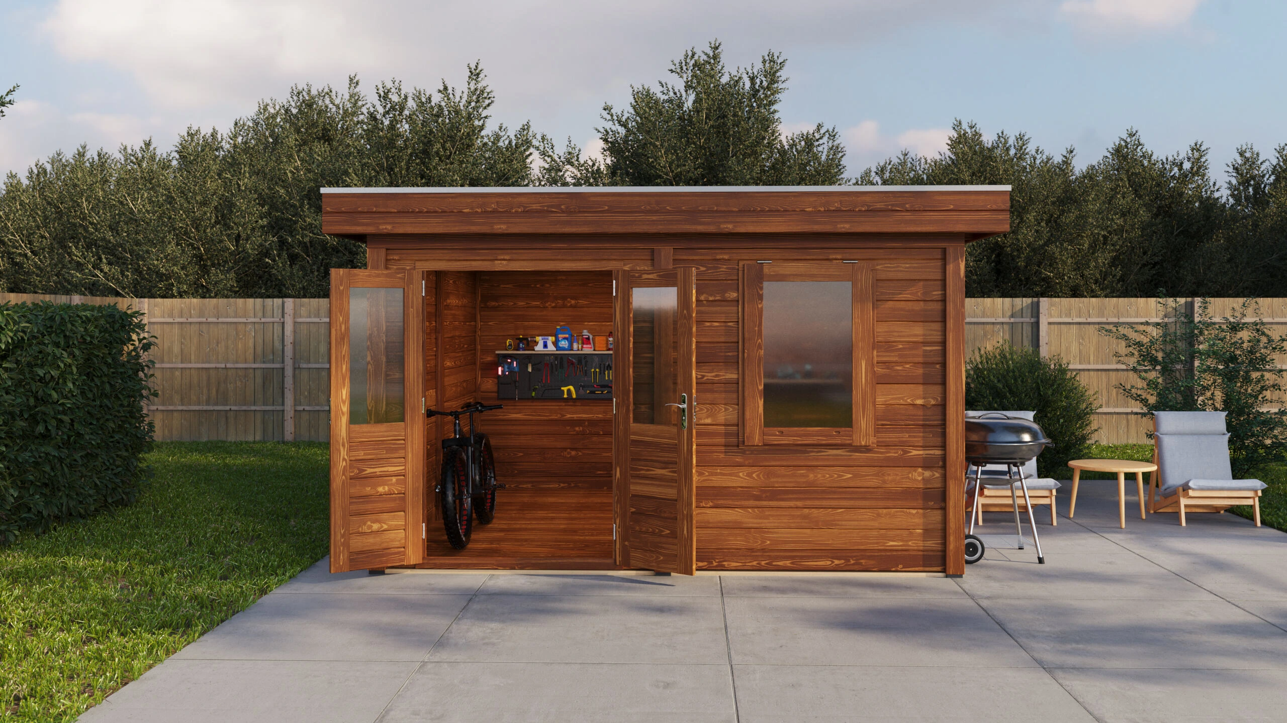 Das Lugarde Select Modern Gartenhaus zeichnet sich durch seine klare, zeitgemäße Architektur aus. Die Grundfläche von 388 × 388 cm ermöglicht eine flexible Nutzung als Arbeitsraum, Hobbyraum oder Rückzugsort.
