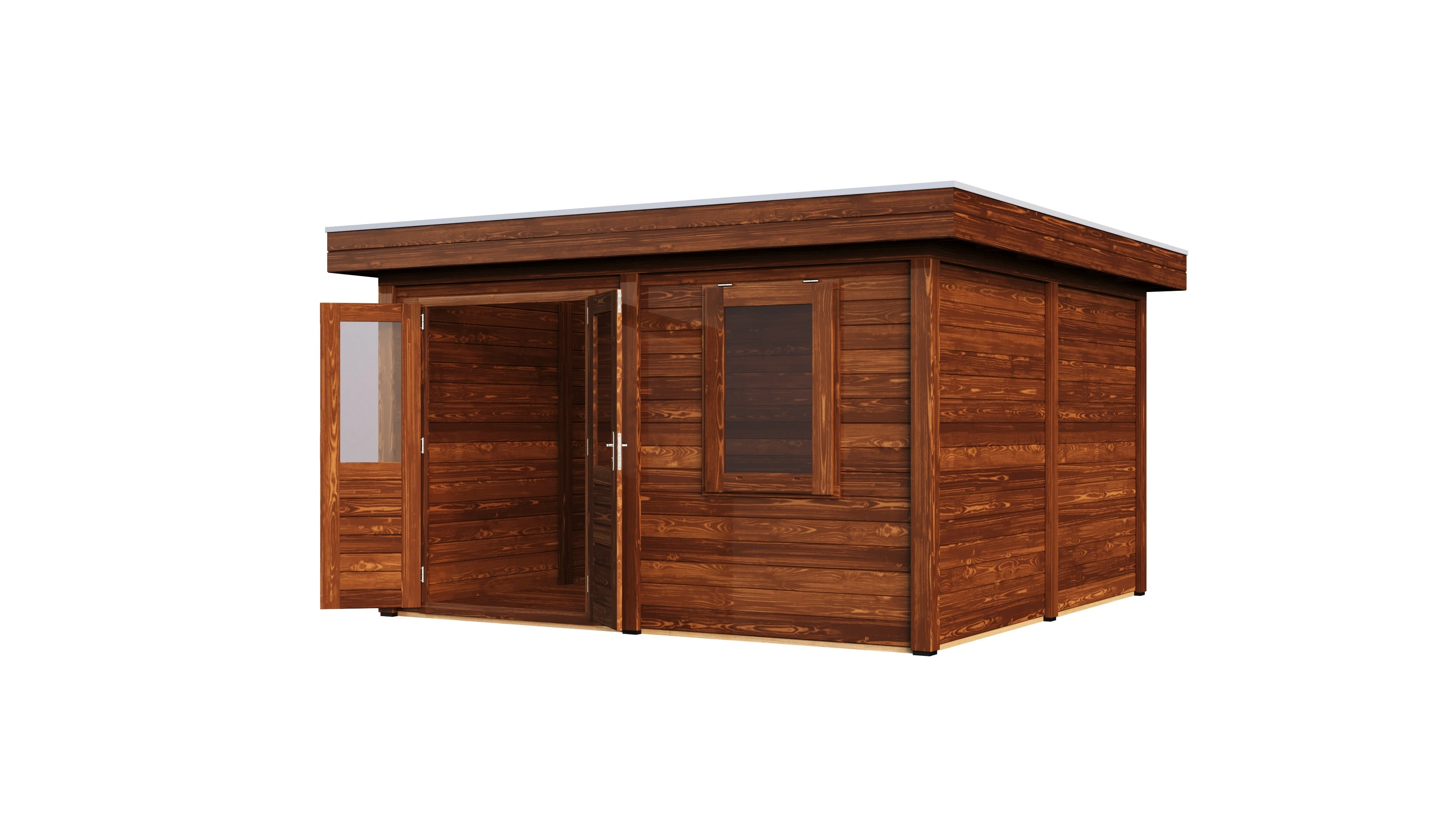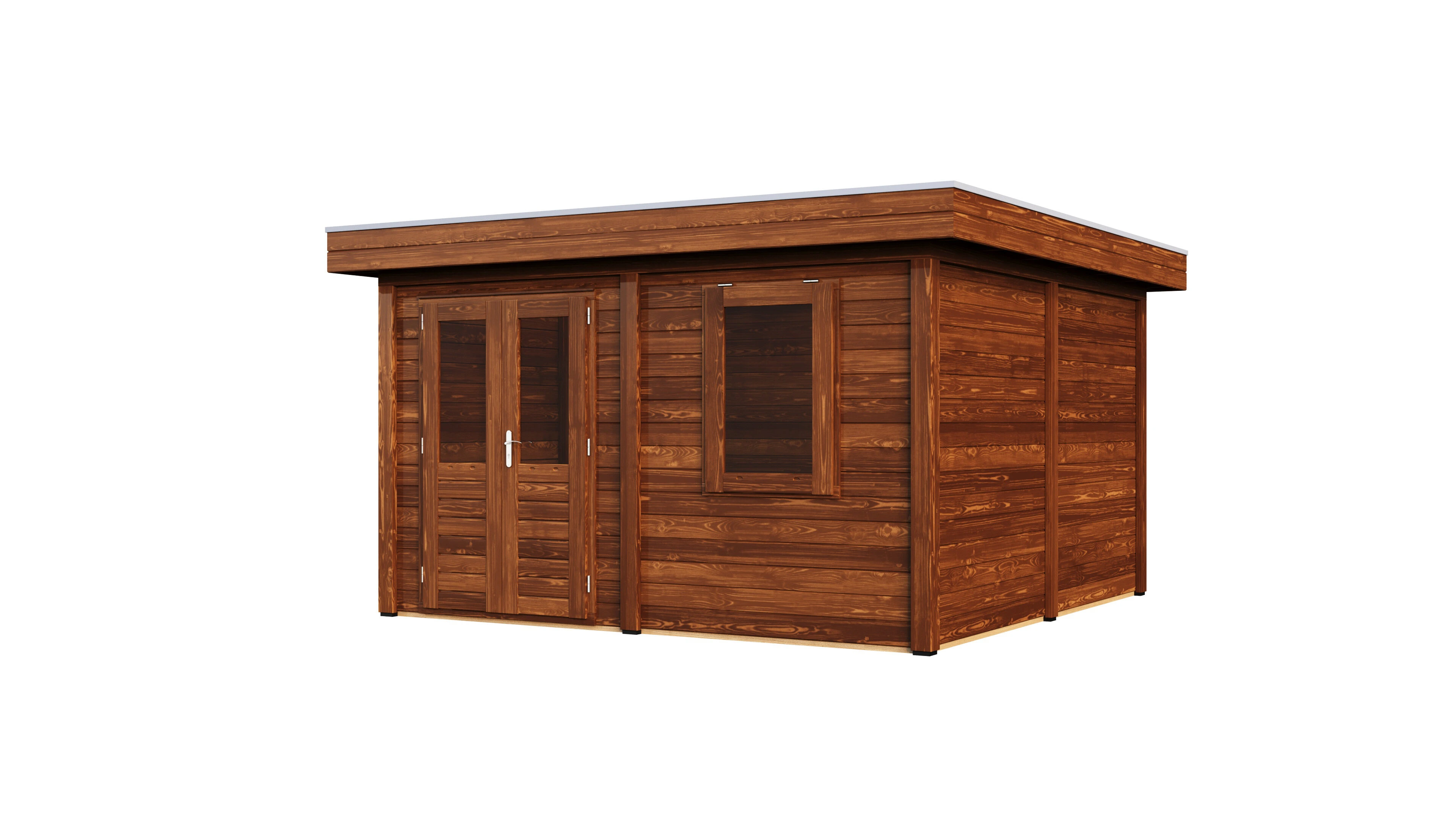 Das charakteristische Flachdach unterstreicht die moderne Formensprache. Die 28 mm starken Wände aus getrocknetem Fichtenholz bieten gute Wärmedämmung und Stabilität. Die Dachkonstruktion mit 18 mm Schalung und Nut-Feder-Verbindung gewährleistet eine dauerhafte Dichtigkeit.