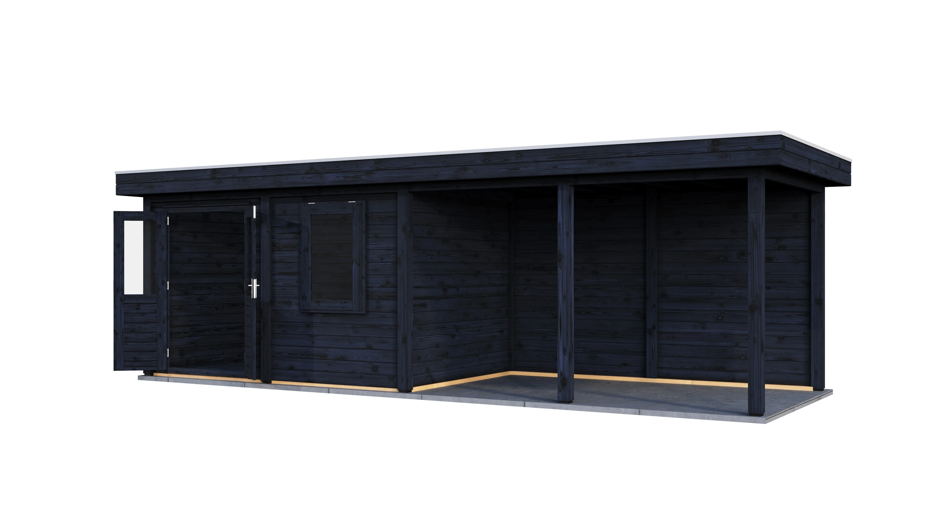 Das charakteristische Flachdach unterstreicht die moderne Formensprache. Die 28 mm starken Wände aus getrocknetem Fichtenholz bieten gute Wärmedämmung und Stabilität. Die Dachkonstruktion mit 18 mm Schalung und Nut-Feder-Verbindung gewährleistet eine dauerhafte Dichtigkeit.