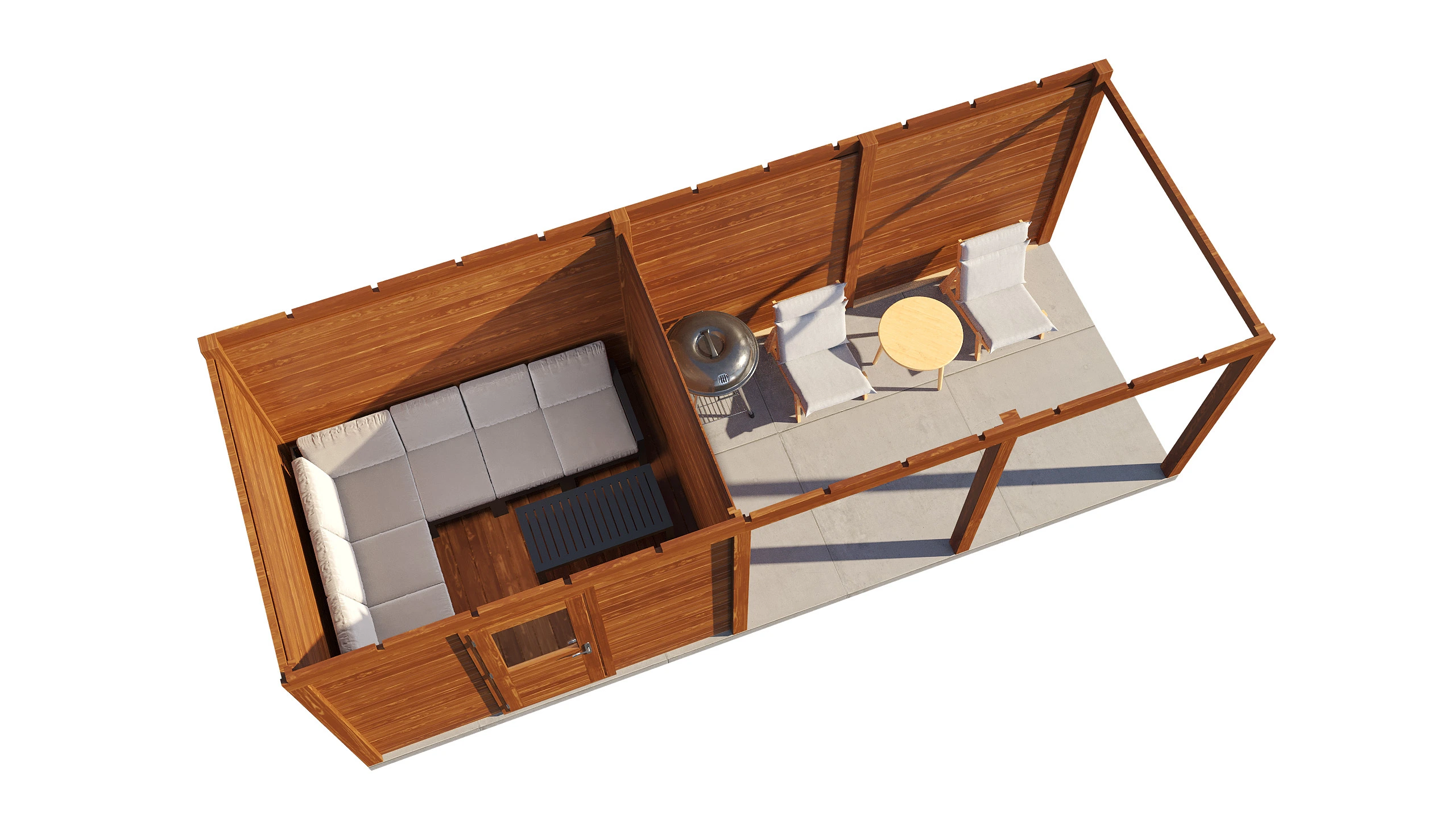 Das charakteristische Flachdach unterstreicht die moderne Formensprache. Die 28 mm starken Wände aus getrocknetem Fichtenholz bieten gute Wärmedämmung und Stabilität. Die Dachkonstruktion mit 18 mm Schalung und Nut-Feder-Verbindung gewährleistet eine dauerhafte Dichtigkeit.