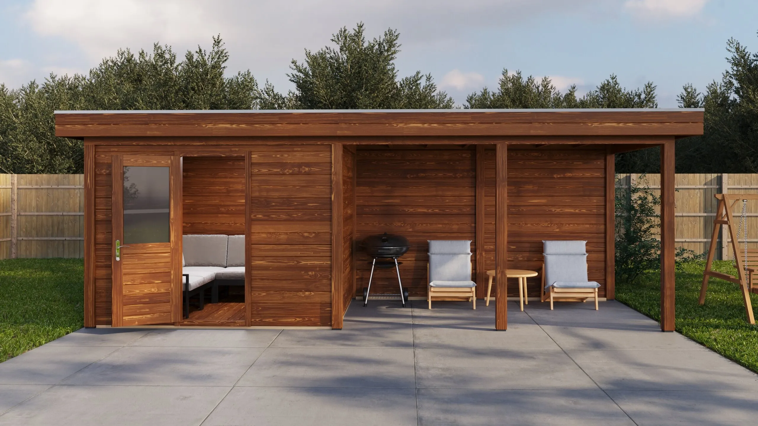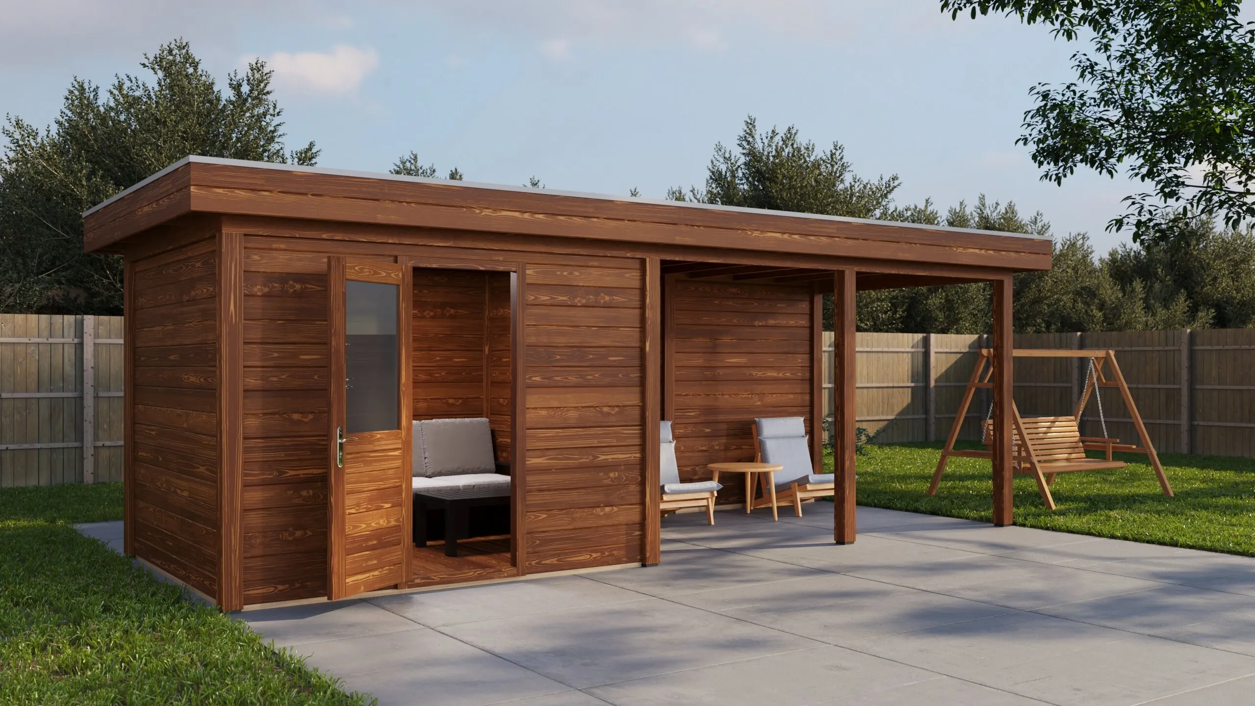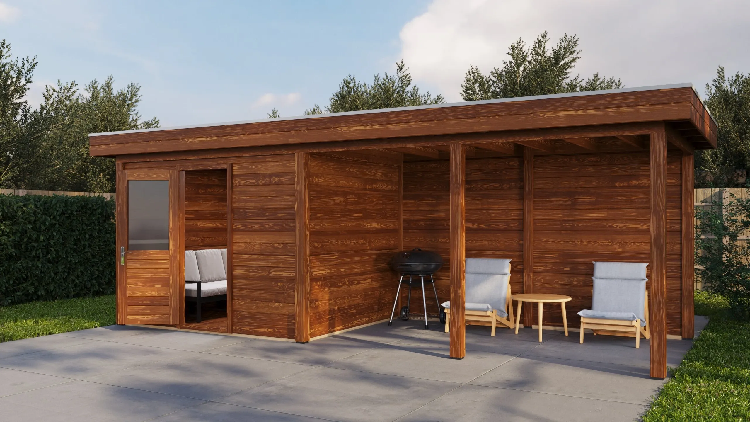 Das charakteristische Flachdach unterstreicht die moderne Formensprache. Die 28 mm starken Wände aus getrocknetem Fichtenholz bieten gute Wärmedämmung und Stabilität. Die Dachkonstruktion mit 18 mm Schalung und Nut-Feder-Verbindung gewährleistet eine dauerhafte Dichtigkeit.