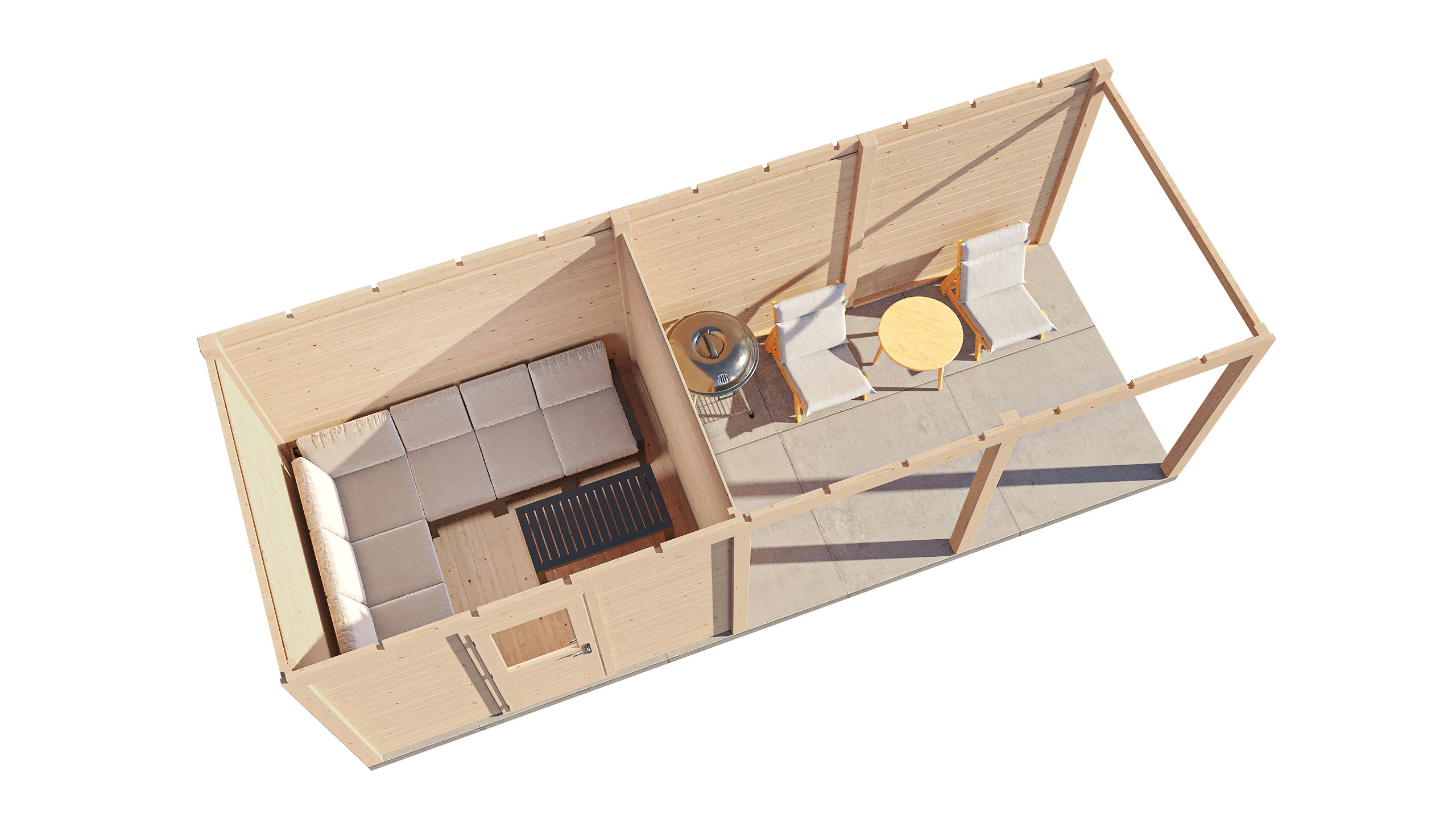 Das charakteristische Flachdach unterstreicht die moderne Formensprache. Die 28 mm starken Wände aus getrocknetem Fichtenholz bieten gute Wärmedämmung und Stabilität. Die Dachkonstruktion mit 18 mm Schalung und Nut-Feder-Verbindung gewährleistet eine dauerhafte Dichtigkeit.