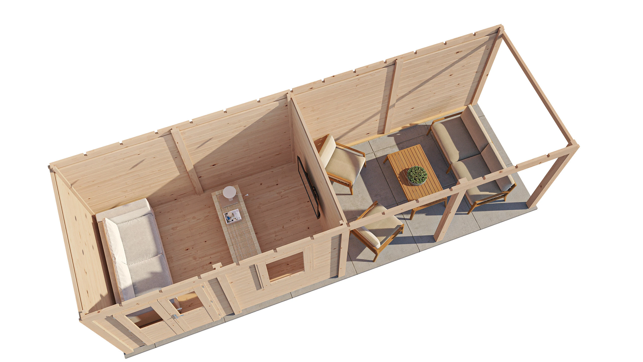 Das charakteristische Flachdach unterstreicht die moderne Formensprache. Die 28 mm starken Wände aus getrocknetem Fichtenholz bieten gute Wärmedämmung und Stabilität. Die Dachkonstruktion mit 18 mm Schalung und Nut-Feder-Verbindung gewährleistet eine dauerhafte Dichtigkeit.