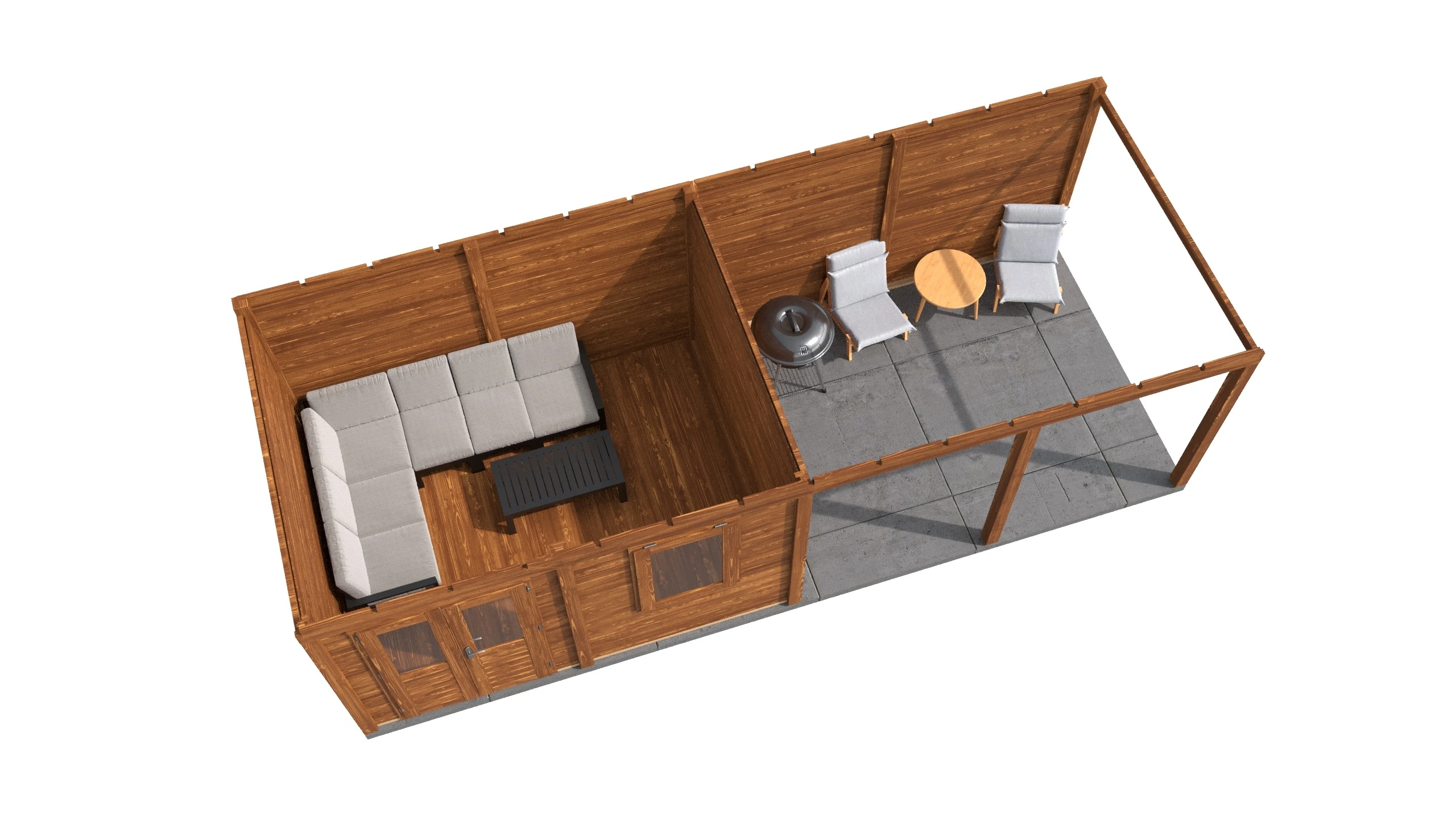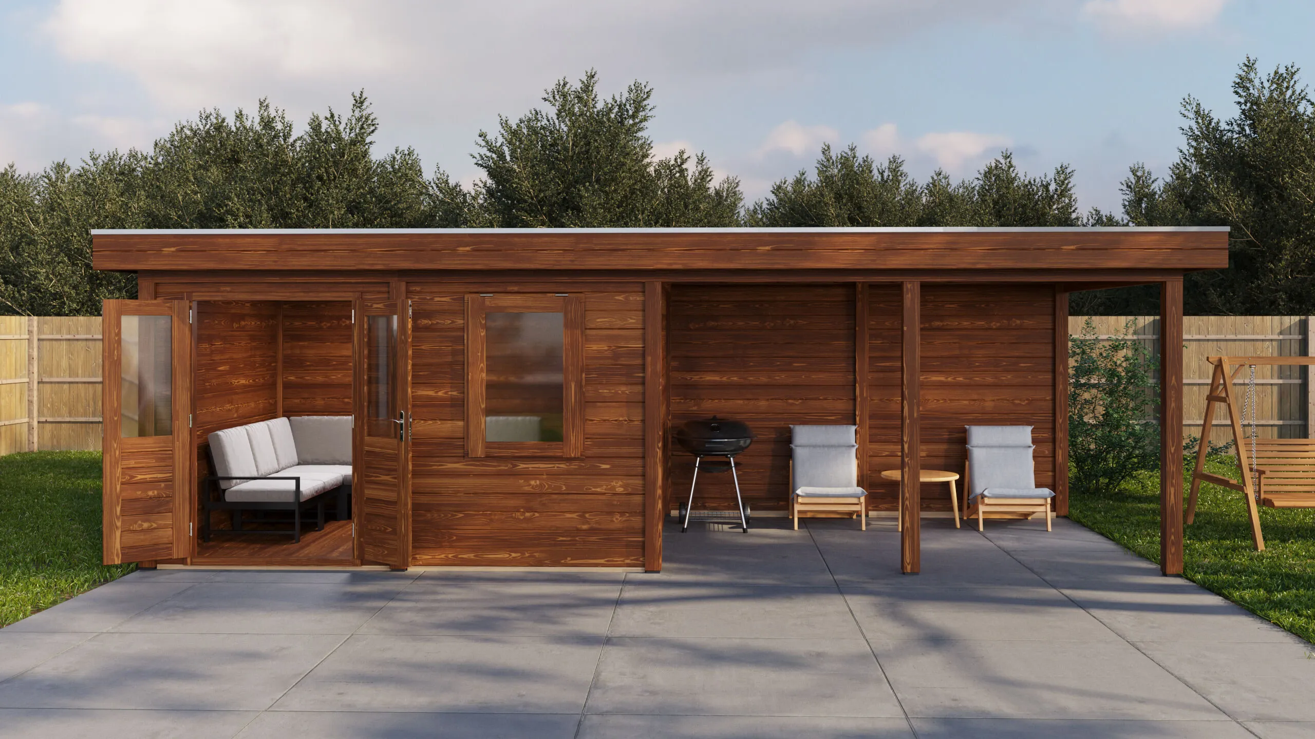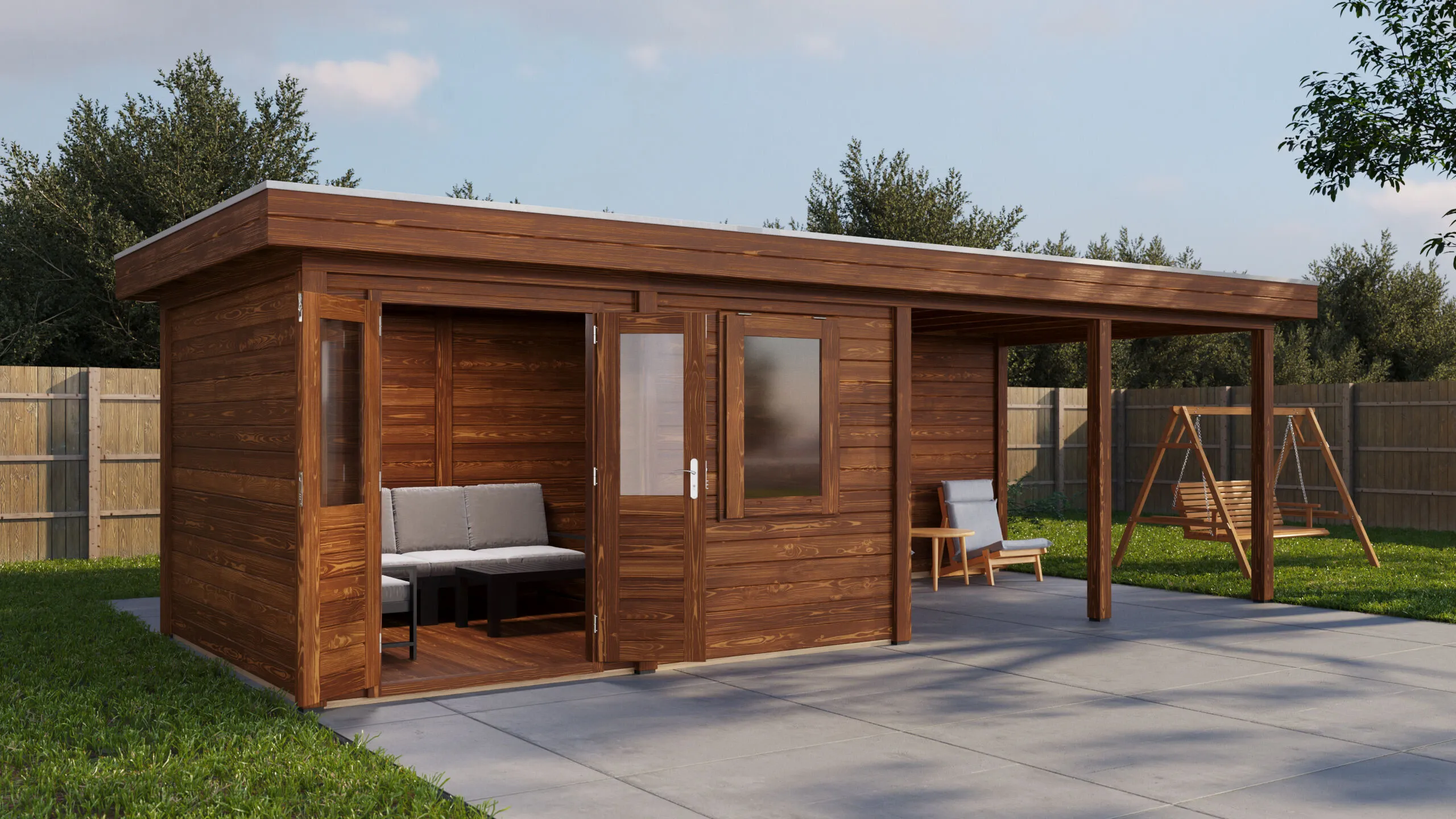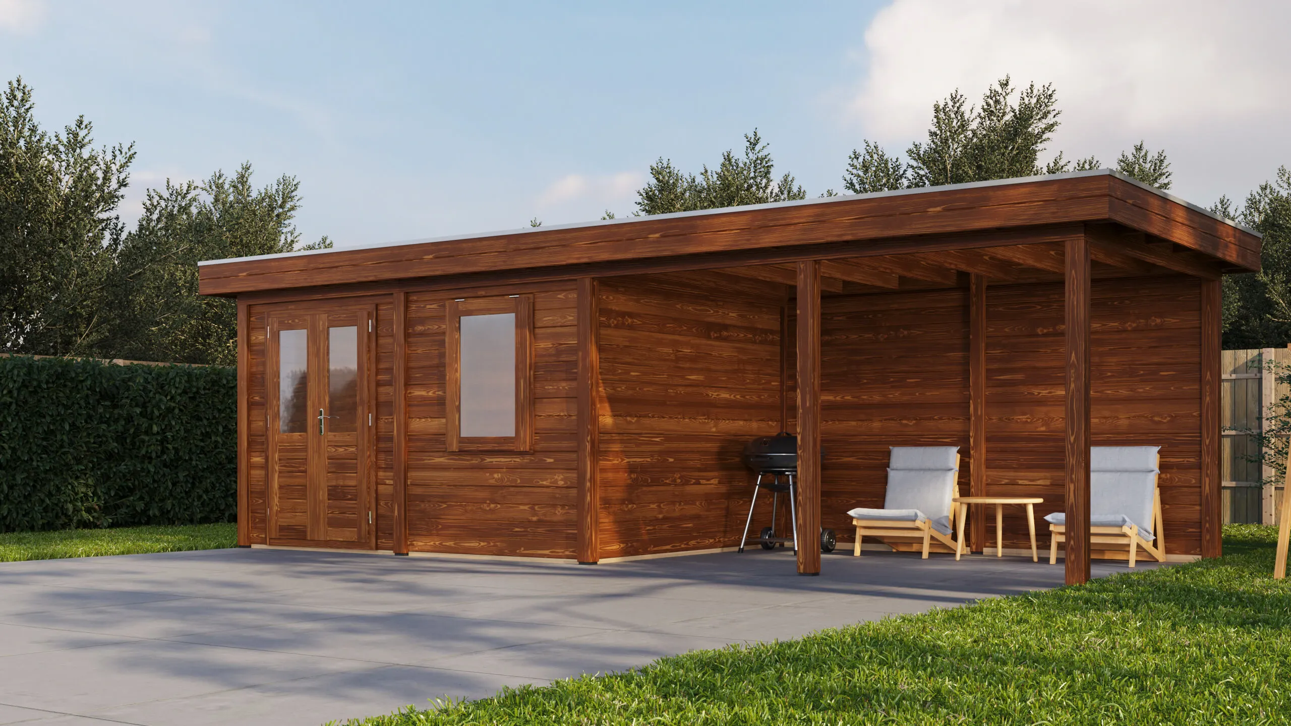 Das charakteristische Flachdach unterstreicht die moderne Formensprache. Die 28 mm starken Wände aus getrocknetem Fichtenholz bieten gute Wärmedämmung und Stabilität. Die Dachkonstruktion mit 18 mm Schalung und Nut-Feder-Verbindung gewährleistet eine dauerhafte Dichtigkeit.