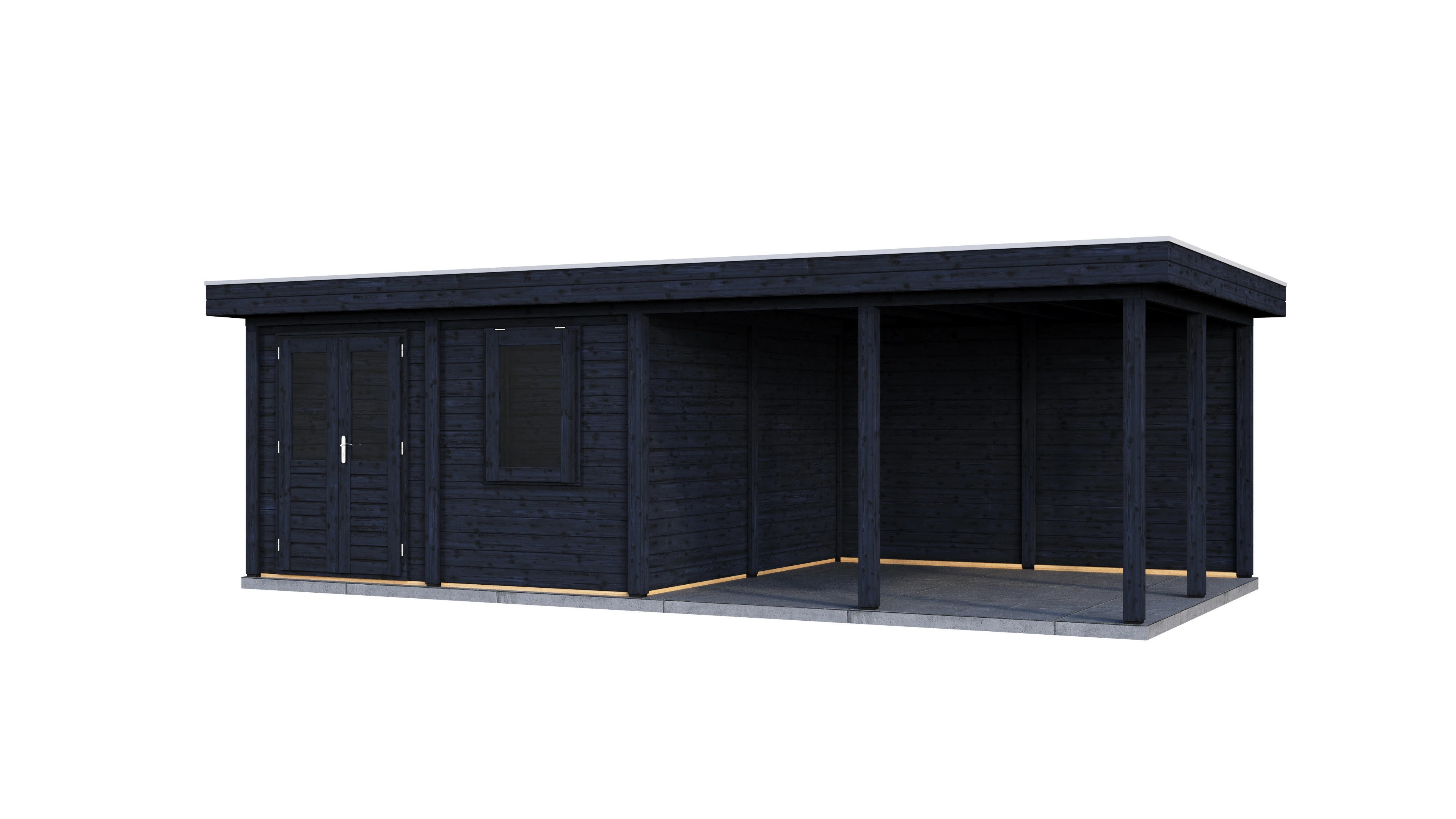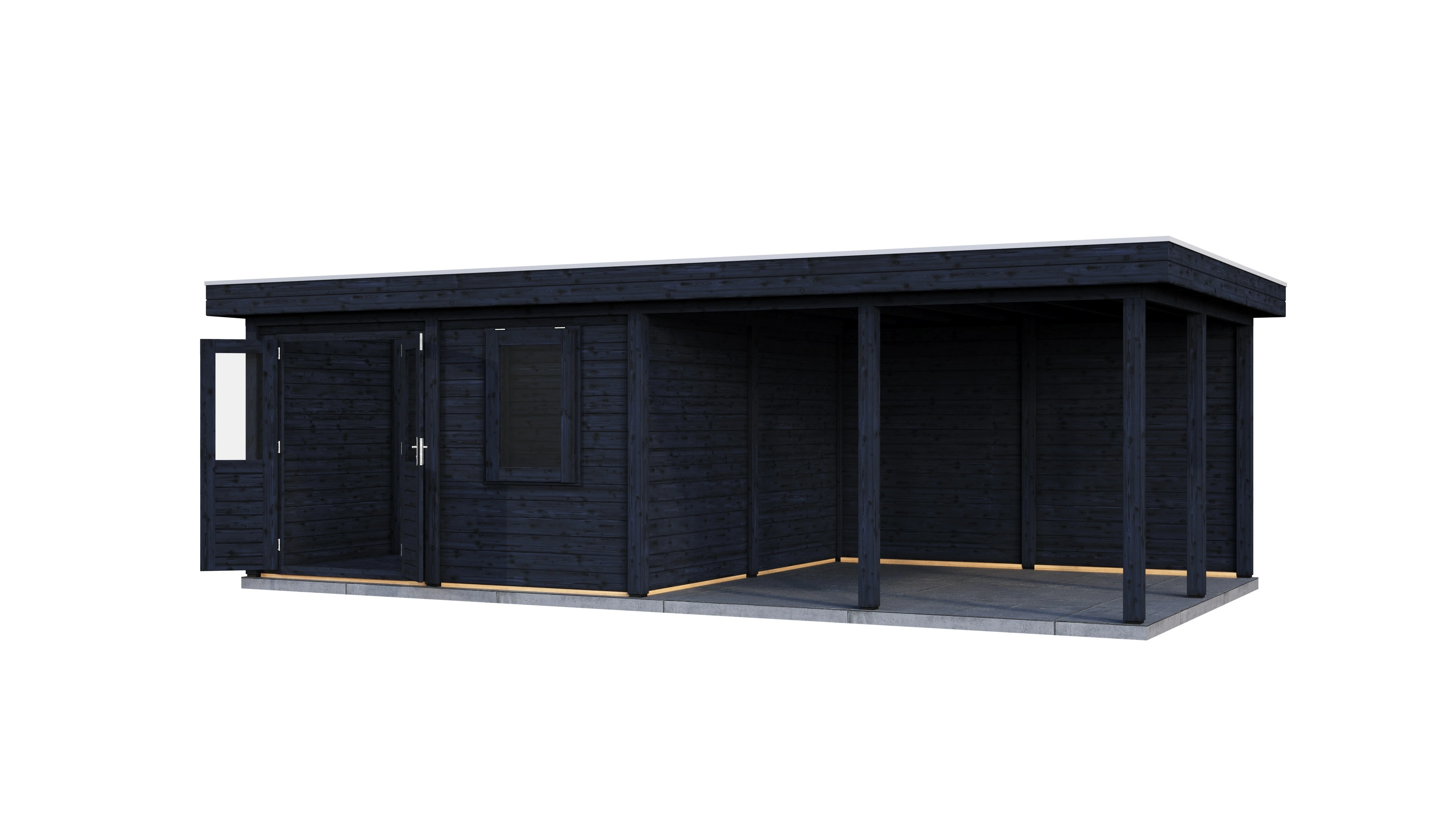 Das charakteristische Flachdach unterstreicht die moderne Formensprache. Die 28 mm starken Wände aus getrocknetem Fichtenholz bieten gute Wärmedämmung und Stabilität. Die Dachkonstruktion mit 18 mm Schalung und Nut-Feder-Verbindung gewährleistet eine dauerhafte Dichtigkeit.